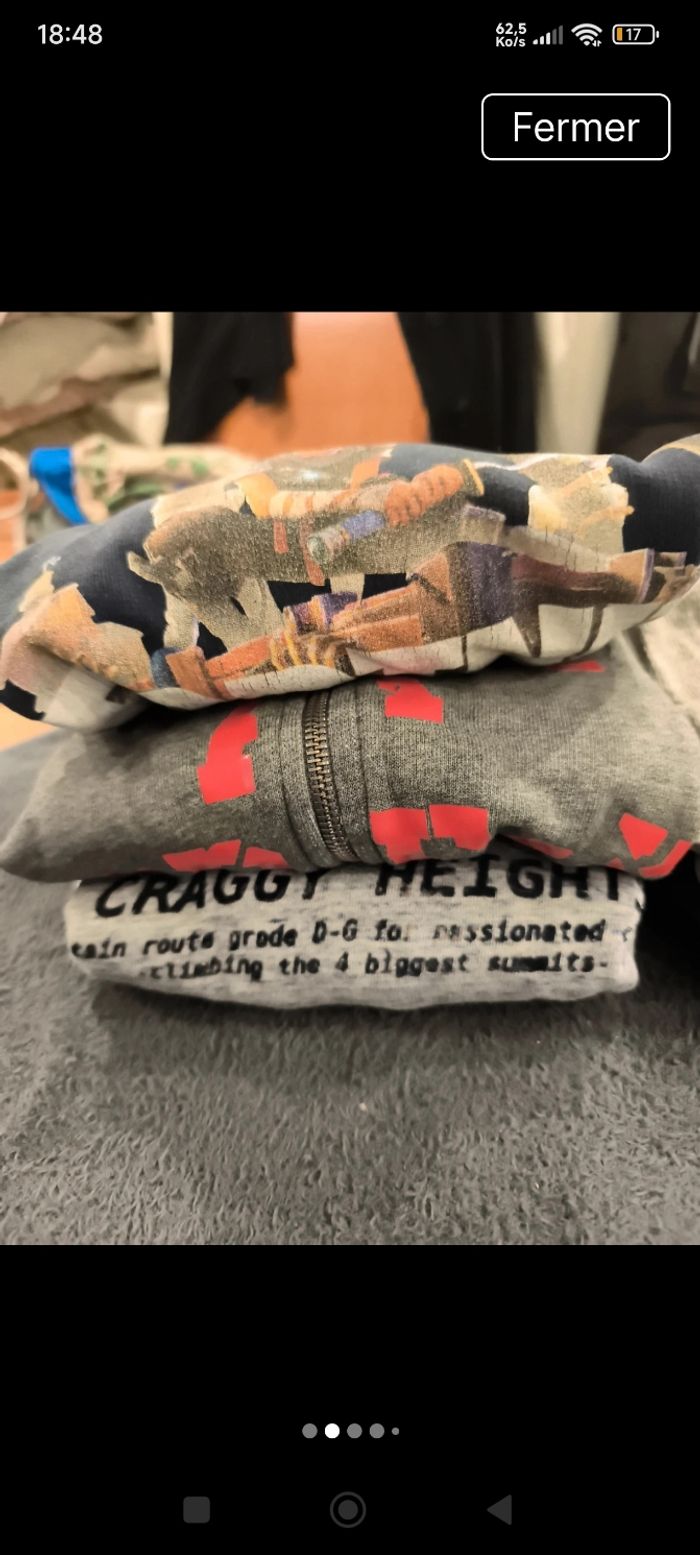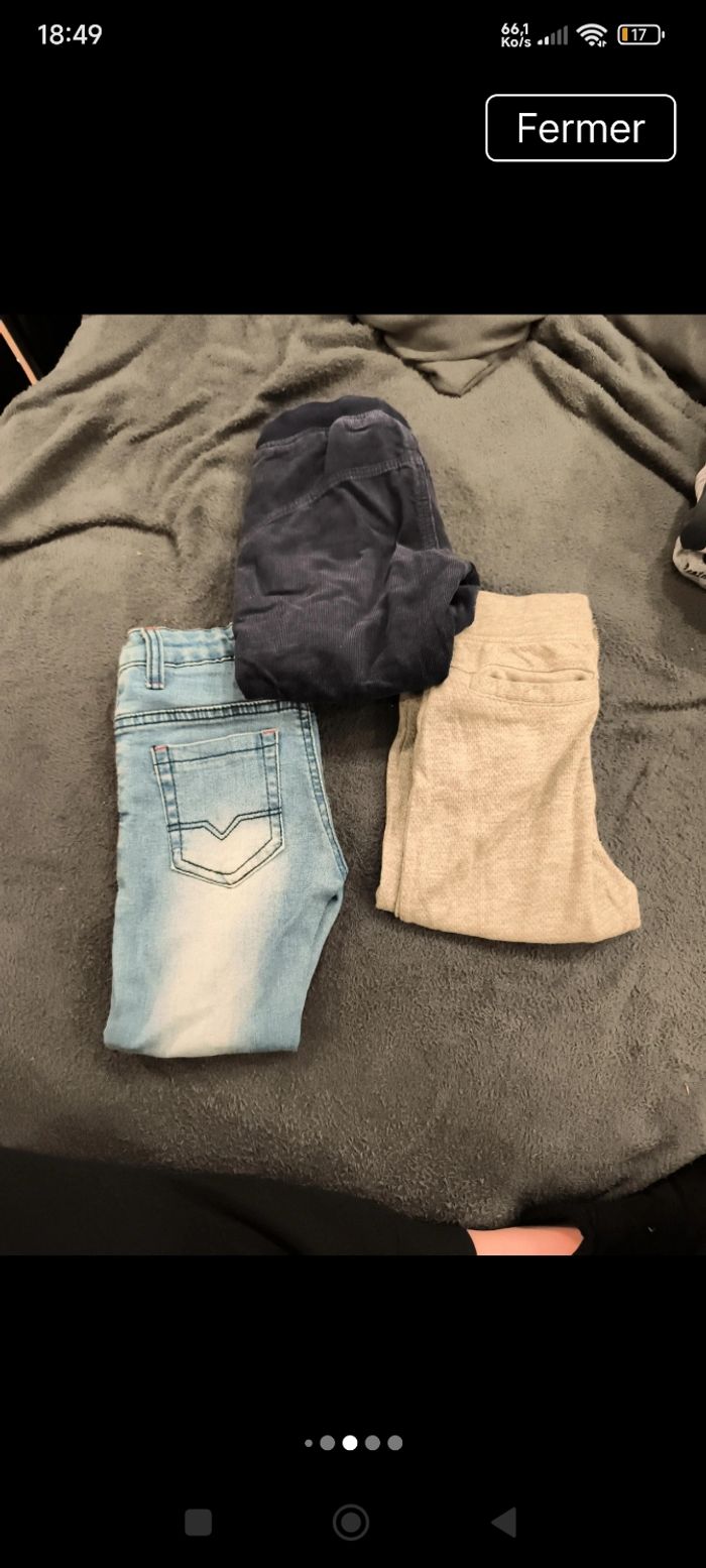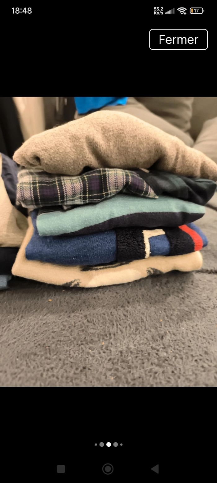 Je vends ce lot de vêtements pour garçon en très bon état. Les articles ont été portés avec soin et ne présentent ni taches ni trous. Parfait pour renouveler la garde-robe à petit prix ! Le lot comprend plusieurs pièces (voir photos) : Hauts : Plusieurs pulls, sweats à motifs et chemises à carreaux. Bas : Pantalons confortables et jeans. Ensemble : Vêtements de marques variées avec des designs sympas (animaux, graphiques).