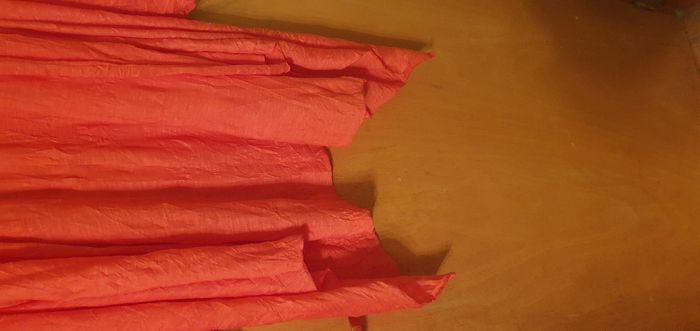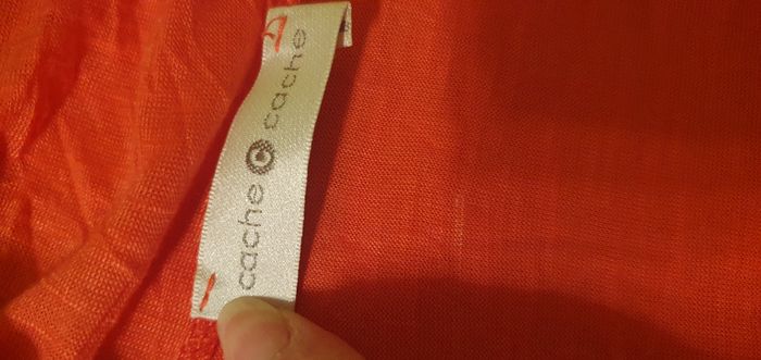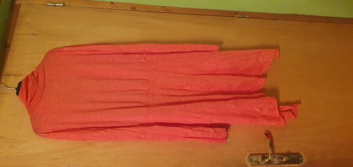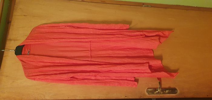 Veste/gilet léger corail de chez Cache-Cache, taille 4, 100% polyester, manches longues 60cms, se porte non fermé, col forme "châle" le devant déstructuré se termine en pointe de chaque côté et le dos présente une couture d'empiècement au niveau du bassin pour permettre ses pointes sur les côtés. Largeur dos d'aisselle à aisselle 45cms, longueur au+ court 90cms, au + long (pointes) 110cms.