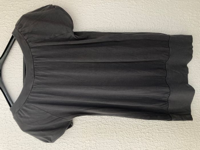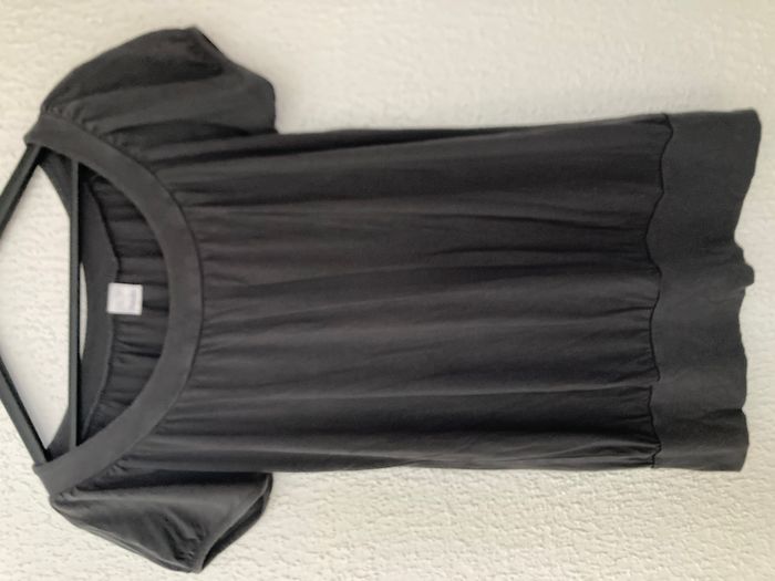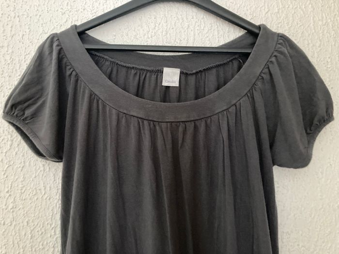 Tee-shirt gris Camaïeu, resserré en bas. Longueur épaule jusqu'en bas 64 cm, largeur aisselle-aisselle 50 cm. Pas d'étiquette.