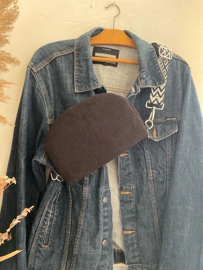 Sac demi-lune en velours côtelé noir Fermeture zip argentée Bandoulière réglable à motifs graphiques Anneaux et mousquetons métalliques 📏 Dimensions : • Largeur : 25 cm • Hauteur : 18 cm État : Très bon état —jamais utilisé Style : bohème / casual chic
