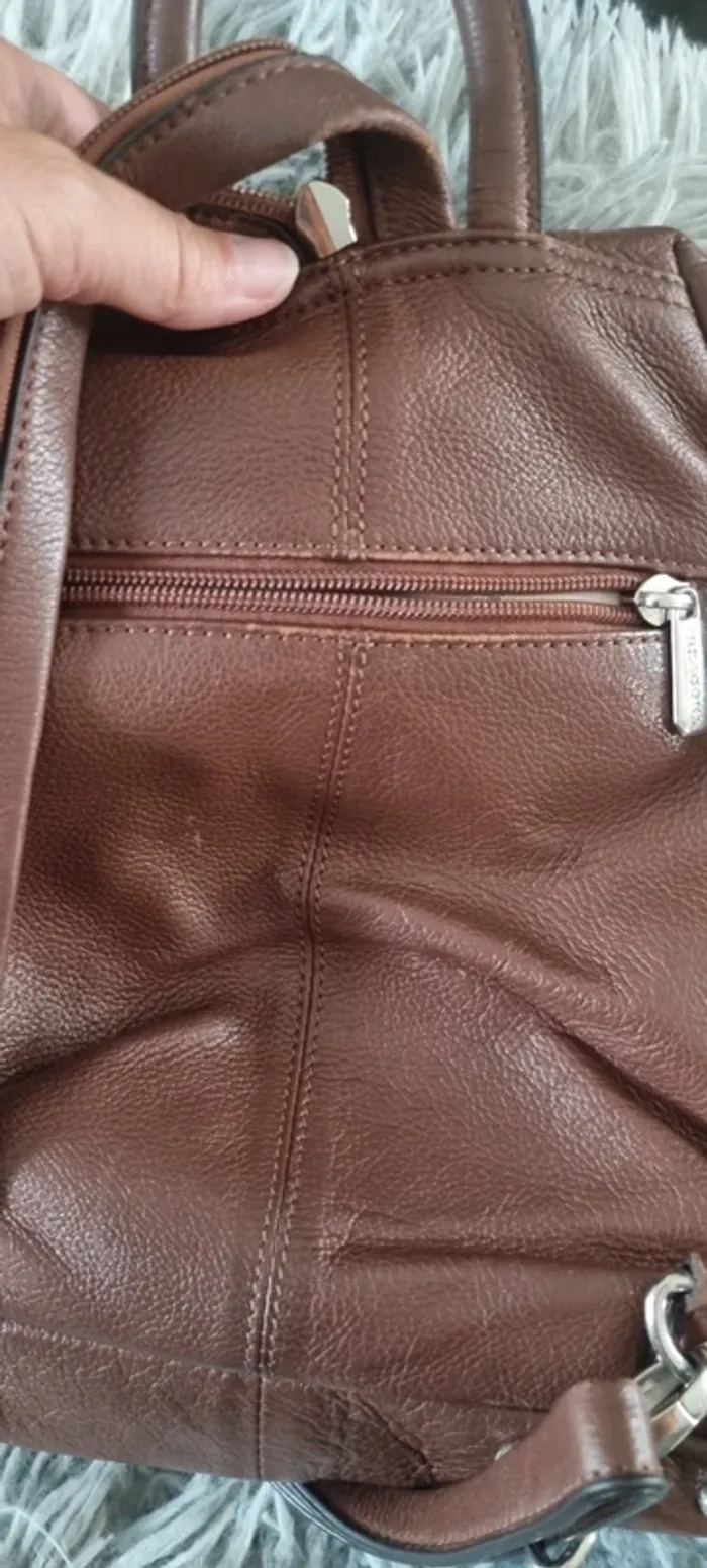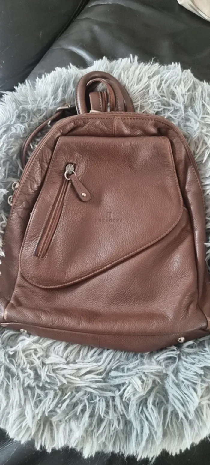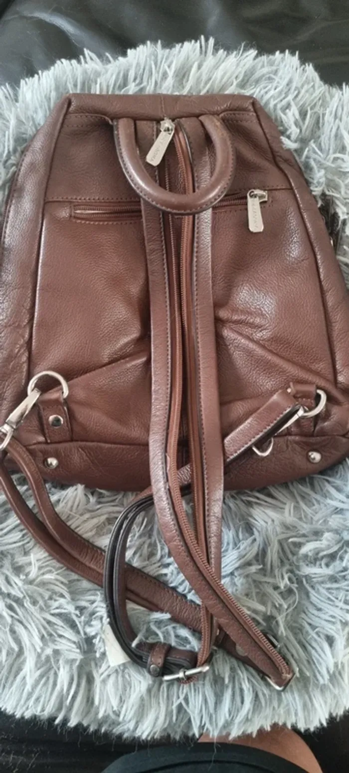 Sac à dos en cuir de la marque Hexagona. Excellente qualité. Il y a de nombreuses poches de rangement. La couleur du cuir est légèrement abîmée en bas et il y a une toute petite tâche à l'intérieur (voir photos). Sinon le sac est en parfait état.
