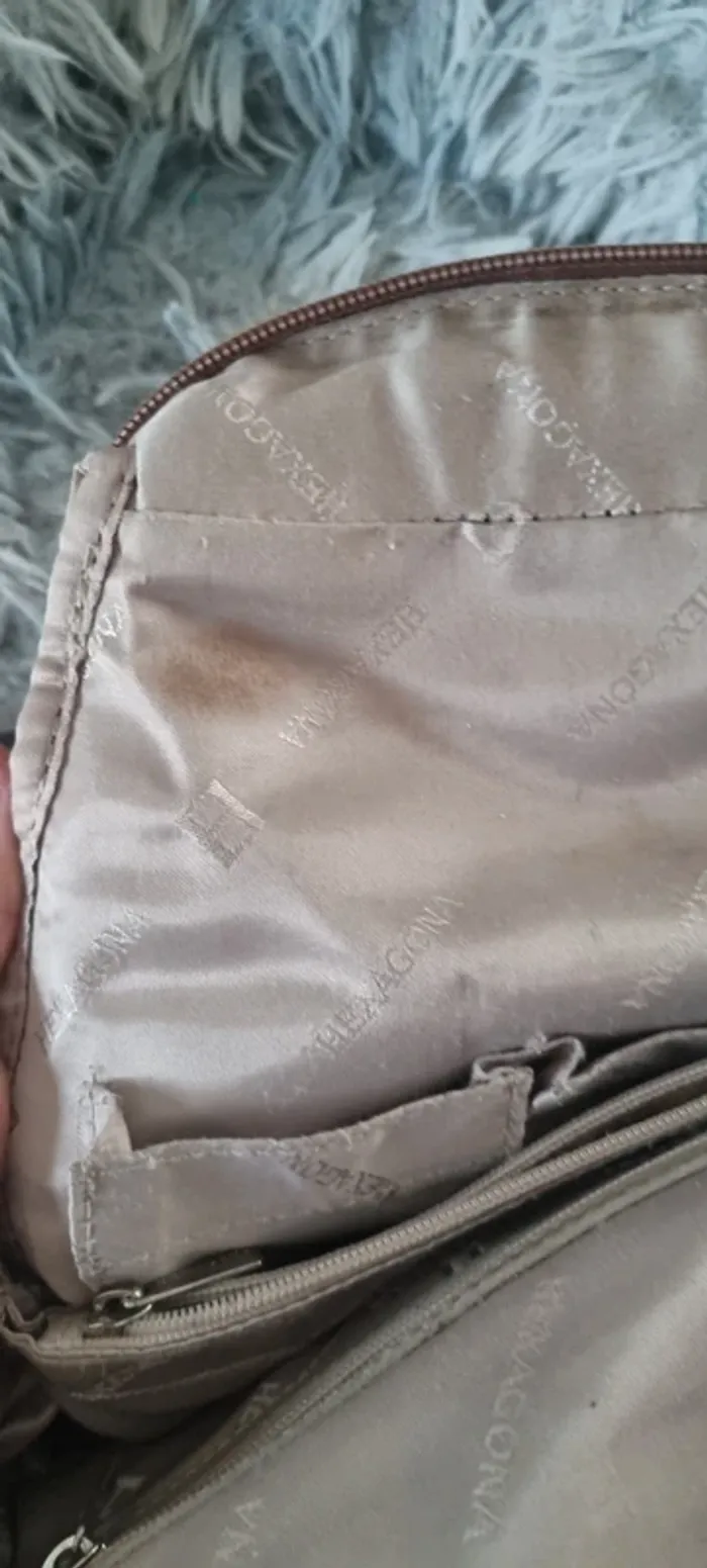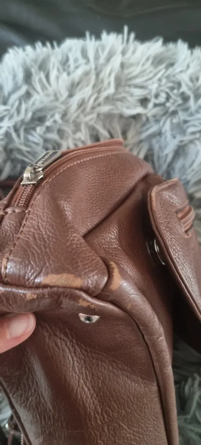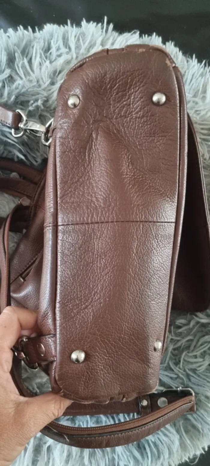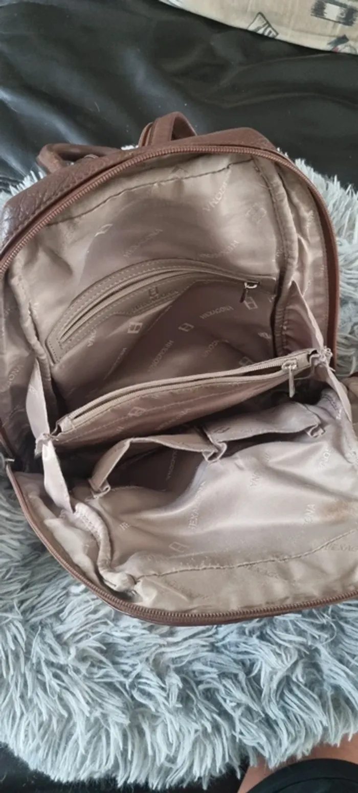 Sac à dos en cuir de la marque Hexagona. Excellente qualité. Il y a de nombreuses poches de rangement. La couleur du cuir est légèrement abîmée en bas et il y a une toute petite tâche à l'intérieur (voir photos). Sinon le sac est en parfait état.