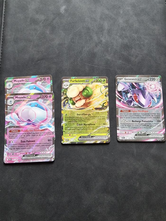 Bonjour, Je mets en vente ce lot de cartes ex : Moyade x2 Farfaduvet Genesect Si questions ou lots, n'hésitez pas à me dm !