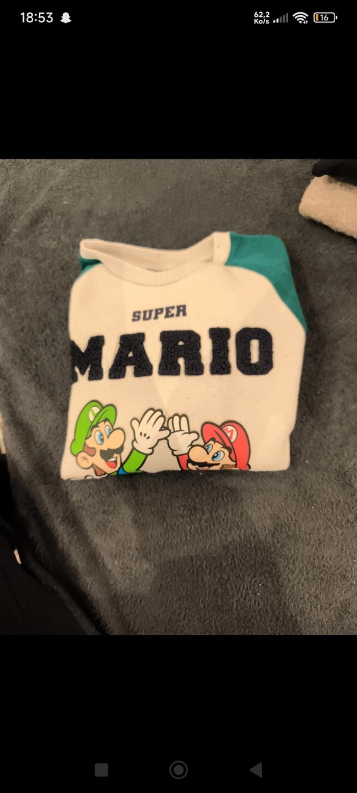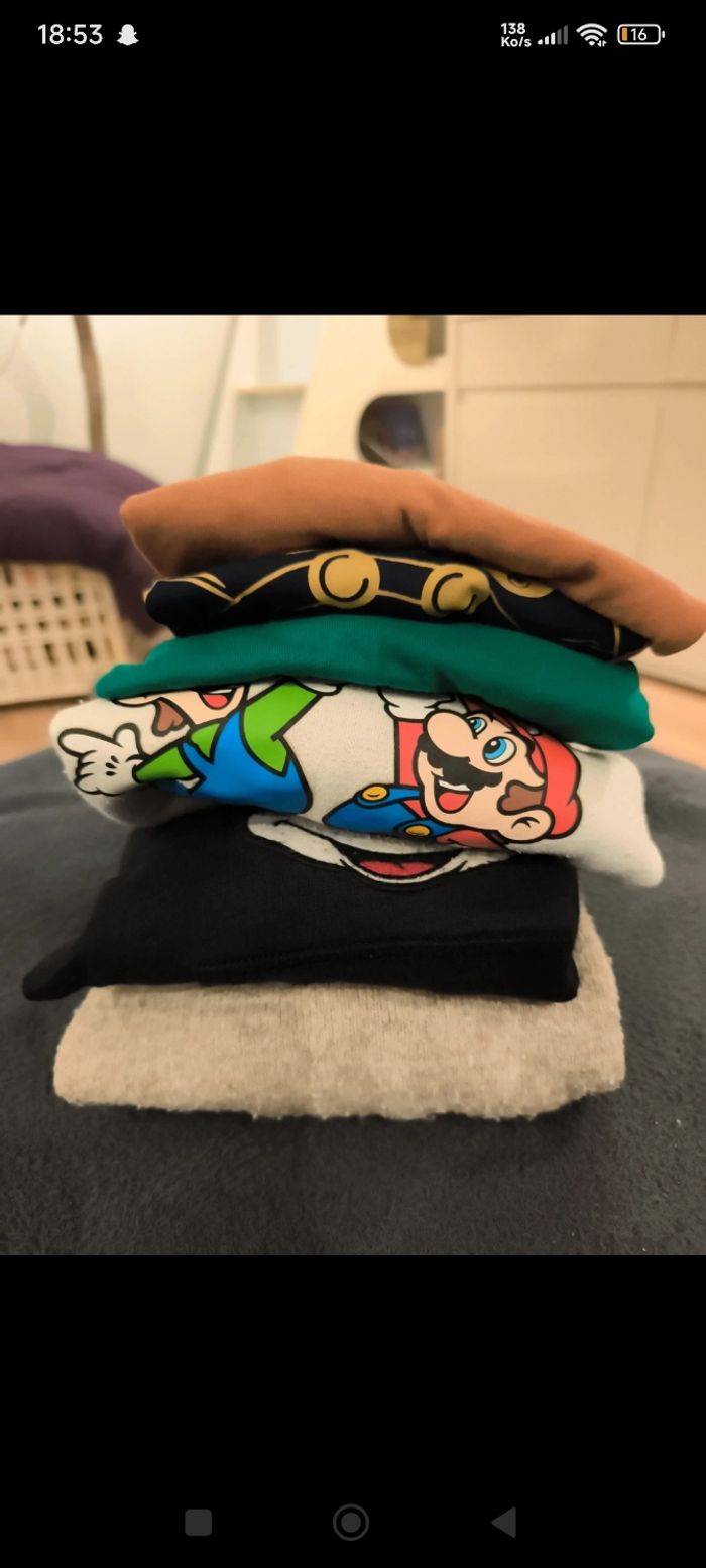 Je vends ce lot de 5 hauts indispensables pour un fan de jeux vidéo et de personnages : ​1 Sweat Super Mario & Luigi : le favori des enfants. ​1 Sweat Mickey Mouse : un classique indémodable. ​1 Pull "Born in the Game" : gris avec détails jaunes. ​1 Pull beige texturé : tout doux et confortable. ​1 T-shirt manches longues vert : basique et pratique.