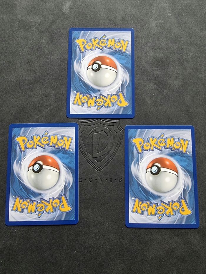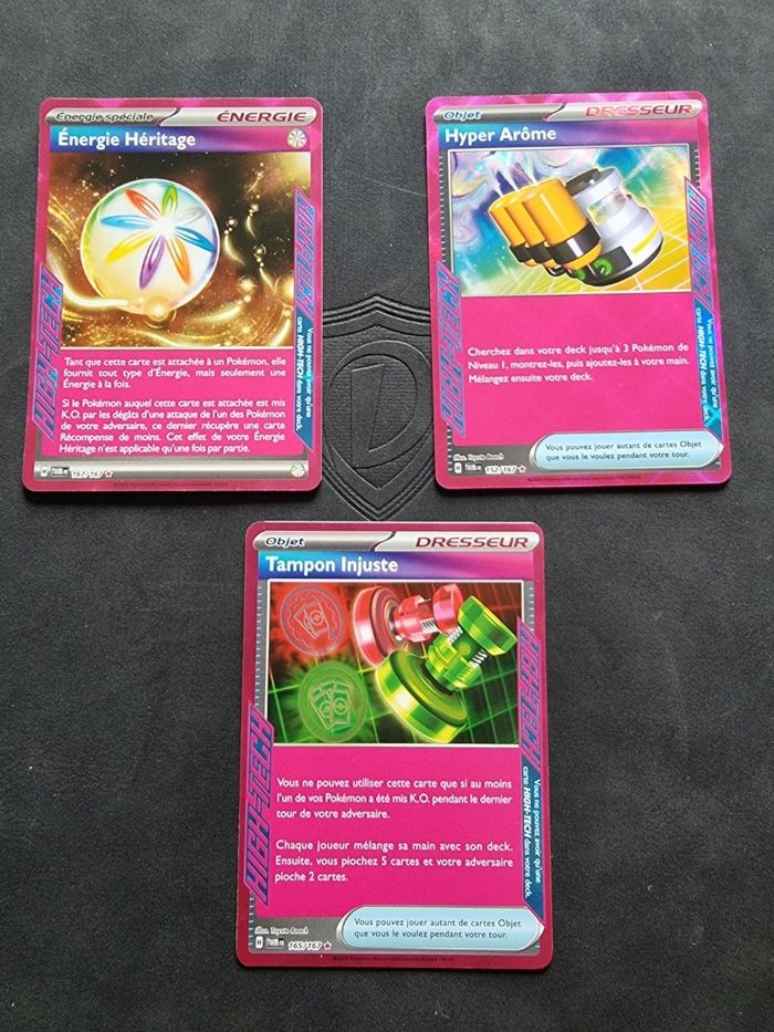Bonjour, Je vends ces 3 cartes high tech sorties de booster et directement protégées ! Tampon Injuste Energie héritage Hyper arôme Si lot ou questions, n'hésitez pas à me dm !