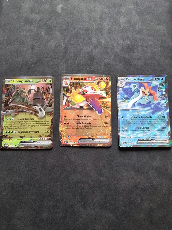 Bonjour ! Je mets en vente ce lot magnifique de la serie Aventures àPaldea . Toutes les cartes sont sorties de booster et vous trouverez : Palmaval EX Chongjian Ex Flamigator EX Si questions ou lot, n'hésitez pas à me dm !
