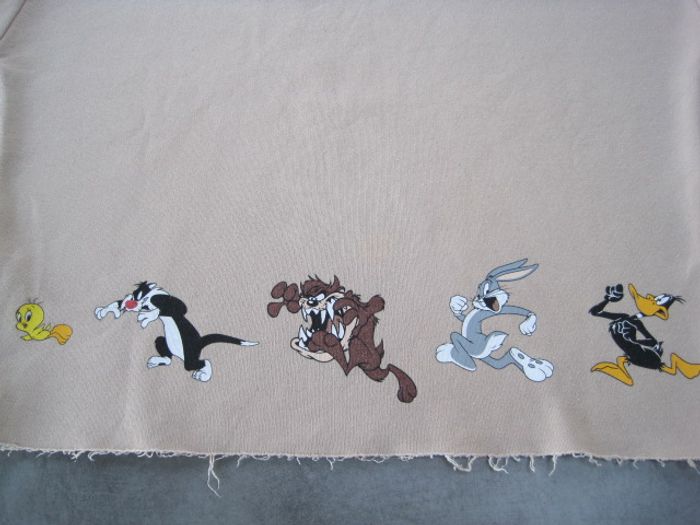 Sweat beige avec impression Bugs Bunny devant et différents personnages Looney Tunes dans le dos en bas. Bas brut (sans côtes) En coton et polyester Très bon état