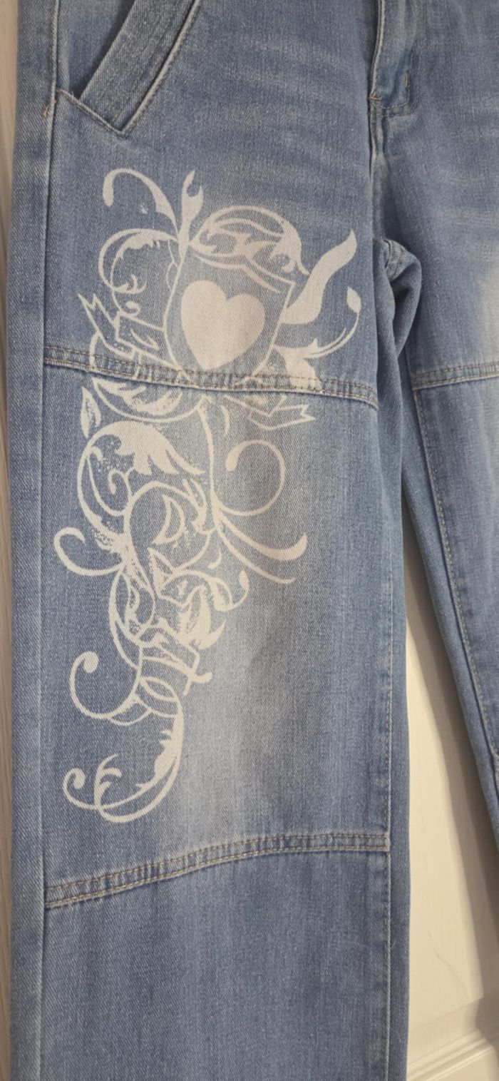 Jean S femme denim clair imprimé cœur – Coupe droite tendance – Excellent état