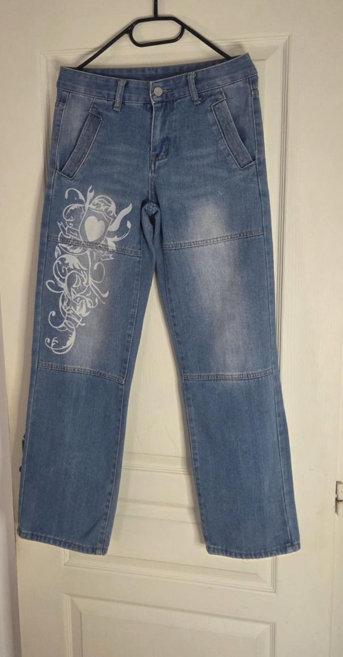 Jean S femme denim clair imprimé cœur – Coupe droite tendance – Excellent état - photo numéro 2