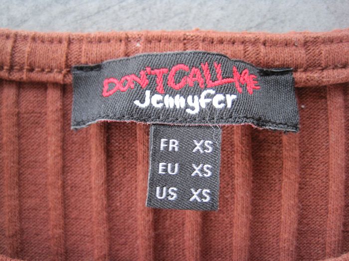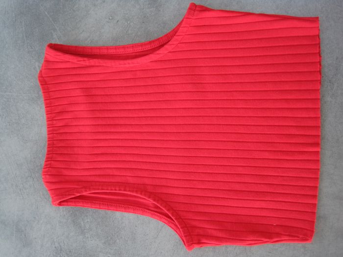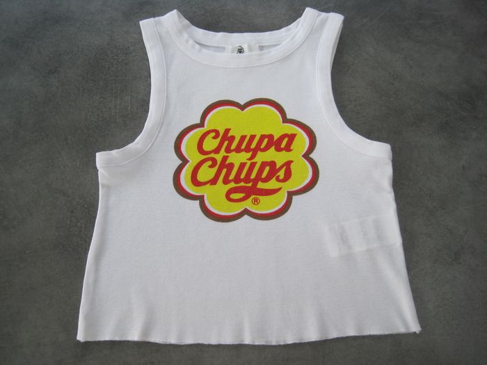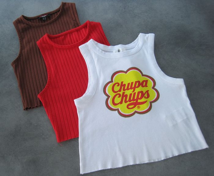 - 1 blanc en coton avec le logo Chupa Chups devant, bas brut largeur d'épaules 25 cm et longueur 39 cm - 1 rouge en polyester coton et elasthanne, côtelé, bas brut également - et 1 marron identique au rouge largeur d'épaule 23 cm et longueur 35 cm Marque Don't call me Jennyfer taille XS Très bon état