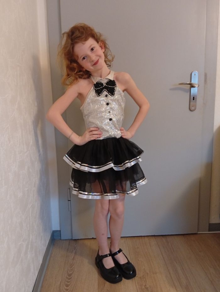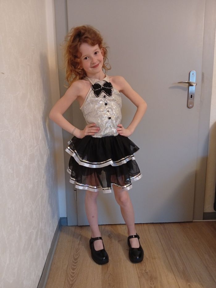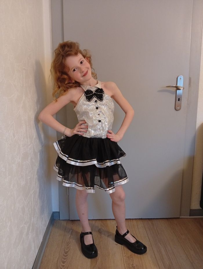 Avec jupon à volants intégré. Marque Révolution. Idéal pour gala de danse. Sequins argentés. Très chic, élégant, style noeud pap. Un ou deux boutons manquants. Taille estimée.