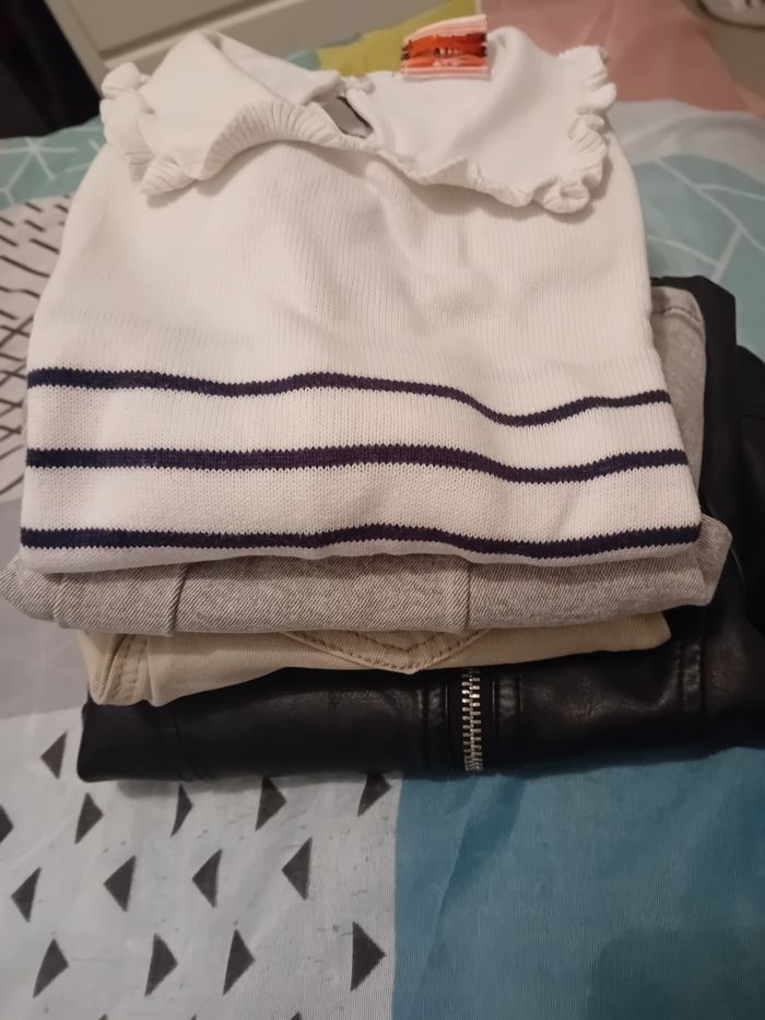 Lot de 4 vêtements fille tape à l'œil un pantalon large 4 ans, une veste noire 5 ans,  une jupe jeans 6 ans et un pull blanc rayures noires 4ans. - photo numéro 1