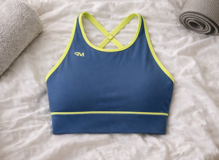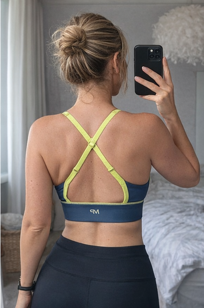 Brassière de sport MyProtein en excellent état. Modèle réversible : • Côté bleu avec détails jaune fluo • Côté jaune fluo uni Dos croisé très joli et bon maintien. Idéale pour fitness, musculation ou yoga. ✔ Taille : M ✔ État : très bon état ✔ Pas portée : juste pour la photo ✔ Maintien confortable Aucun défaut, pas de tache ni d’accroc.