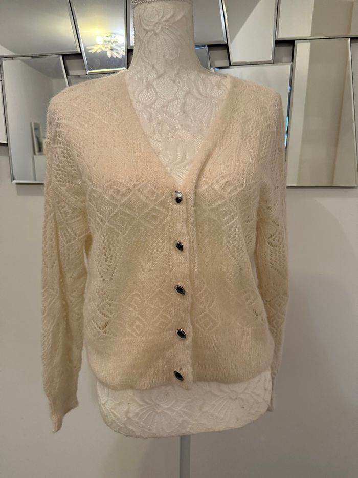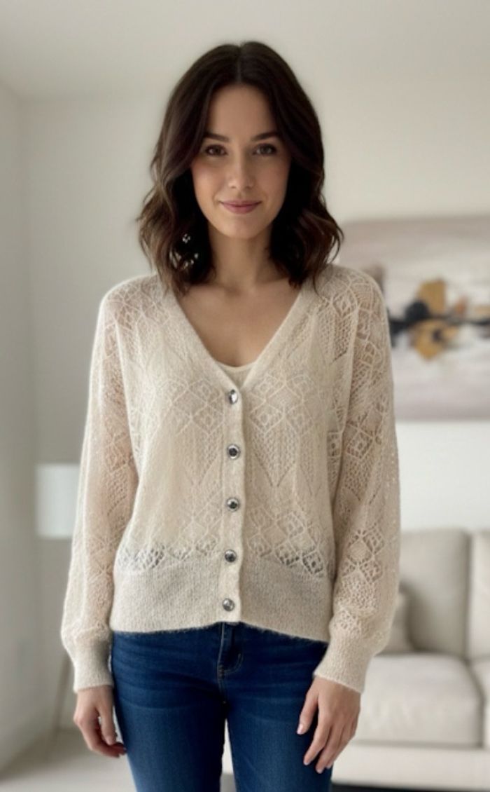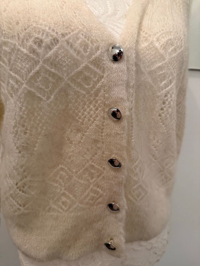 📐Taille S : 36 🏷️ Marque : Morgan 🎨 Couleur : beige / crème 🔒Fermeture : boutons bijoux/ nacrés 🌸Maille ajourée : Le gilet se distingue par un travail de maille complexe avec des motifs géométriques et floraux en transparence, rappelant l'esprit de la dentelle ou du crochet fin.