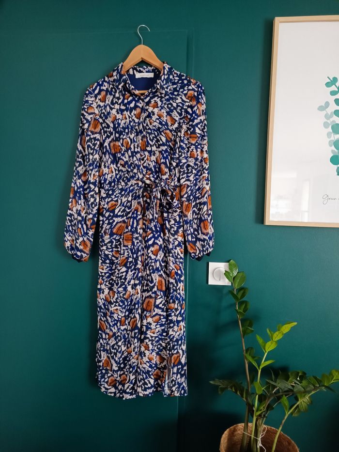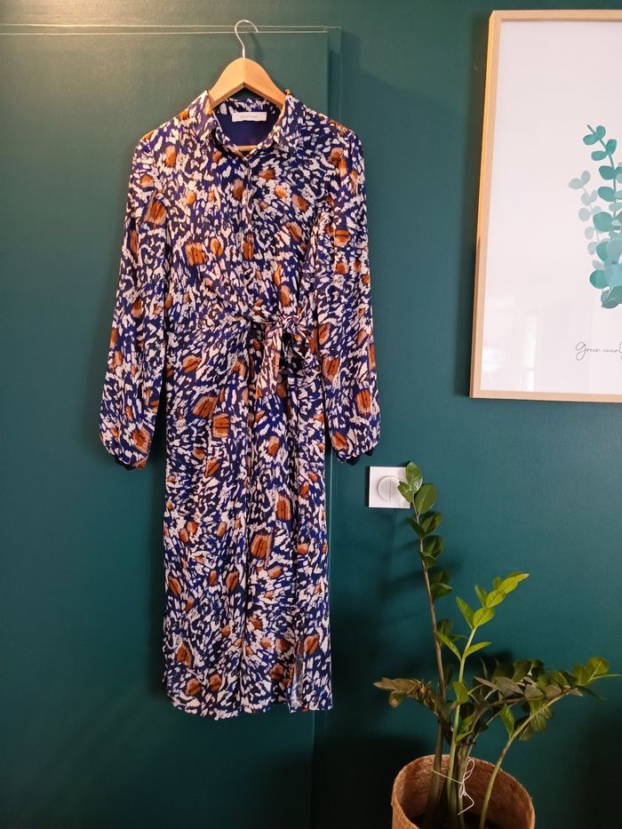 Robe longueur chevilles,doublée corps et manches légèrement transparentes . Taille bien Fond bleu marine et motif caramel