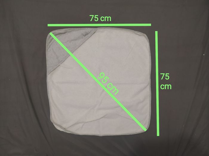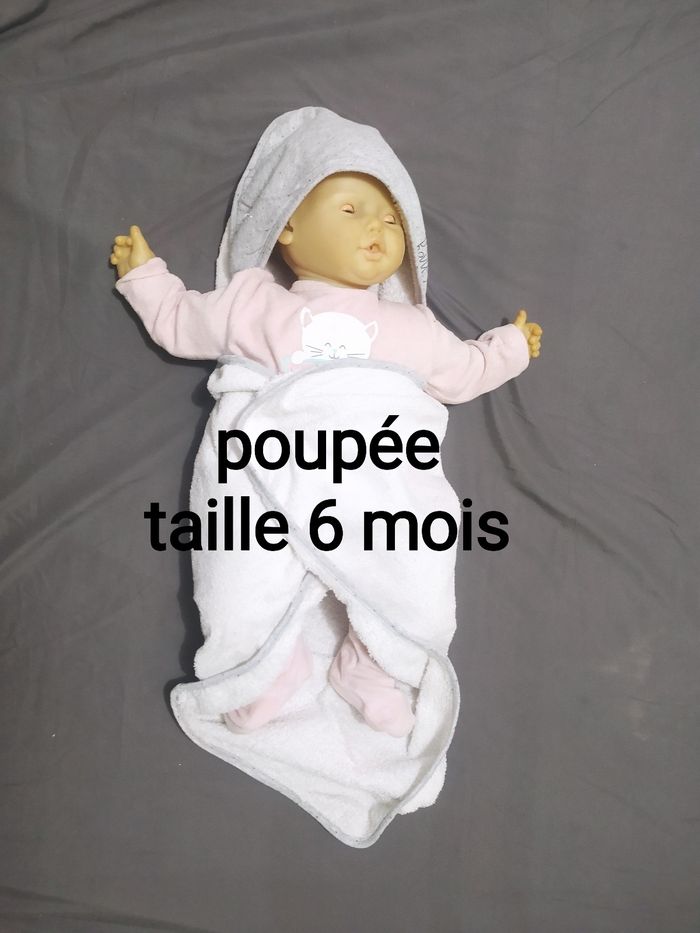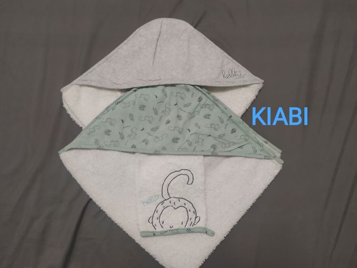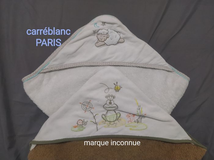 Lot de 4 Serviettes Bébé carrées avec capuche, dimensions: 75x75 cm, diagonale 95 cm, en 100% coton éponge, dès la naissance (là exemple avec une poussée correspondant à un BB de 6 mois, bien enveloppé et y a encore un peu de longueur au niveau des pieds) 1 blanche motif Mouton brodé, marque: carréblanc; 1 maron motif Grenouille brodée, marque inconnue; 1 blanche avec tissus gris étoiles, noté "hell +tête de chat", marque: Kiabi; 1 blanche avec tissus vert et singes, avec le gant assorti 1 singe et "hello" brodés, marque: Kiabi; Bon état peu avoir des traces propres et accros sur le tissus éponge