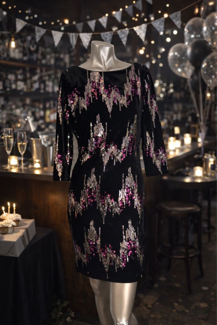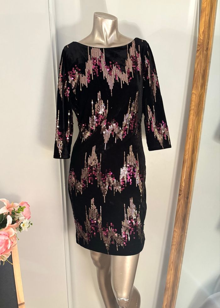 Très jolie robe noire Cache Cache ornée de sequins roses et dorés, effet lumineux et élégant. Coupe près du corps, féminine et flatteuse. Manches 3/4, encolure bateau. Parfaite pour une soirée, un événement ou les fêtes. Tissu doux type velours avec broderies sequins. • Marque : Cache Cache • Taille : M • Couleur : Noir avec sequins rose/doré • Longueur : 91 cm • Largeur aisselle à aisselle : 49 cm • État : Très bon état Modèle chic et intemporel, facile à accessoiriser. #robedesoiree #cachecache #robesequins #robefemme #taillem #soiree #fete #lookchic #secondemain #modefemme