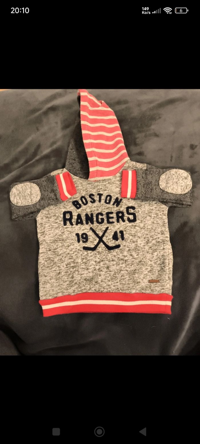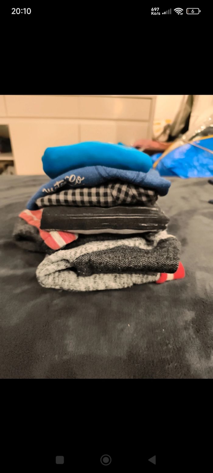 Je vends ce lot complet de vêtements pour garçon, idéal pour l'école et les loisirs. Les articles sont confortables, résistants et faciles à assortir. Détails du lot : Hauts (6 pièces) : 1 pull à capuche gris chiné "Boston Rangers" avec détails rouges. 1 sweat bleu ciel de marque DKNY. 1 pull beige/gris avec rayures graphiques noires. 1 pull bleu avec motif moto vintage. 1 chemise à carreaux vichy (noir/blanc). 1 haut supplémentaire (visible dans la pile). Bas (4 pièces) : 2 jeans bleus classiques (coupe droite). 1 pantalon en velours côtelé beige/camel. 1 pantalon en toile légère (beige/clair).
