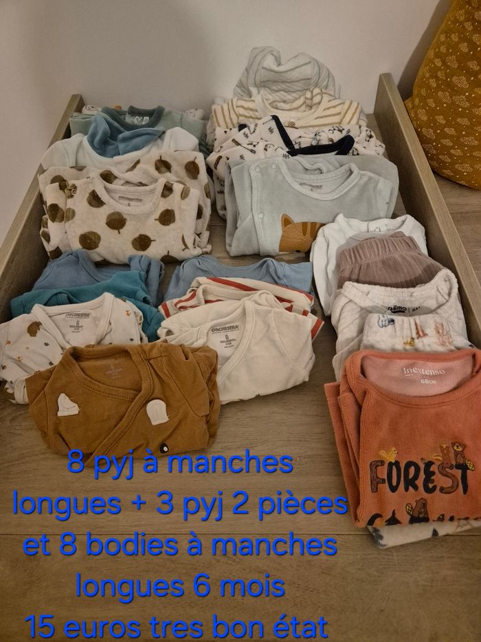 Lot de 8 pyjamas une pièce et 3 pyjamas 2 pièces ainsi que 8 bodies manches longues excellent état