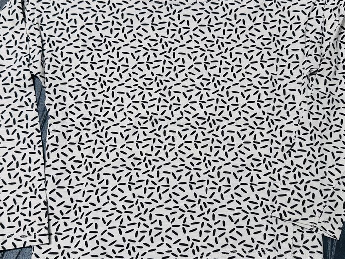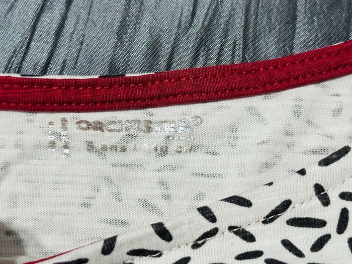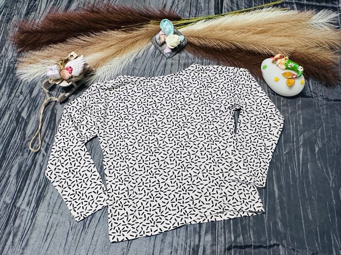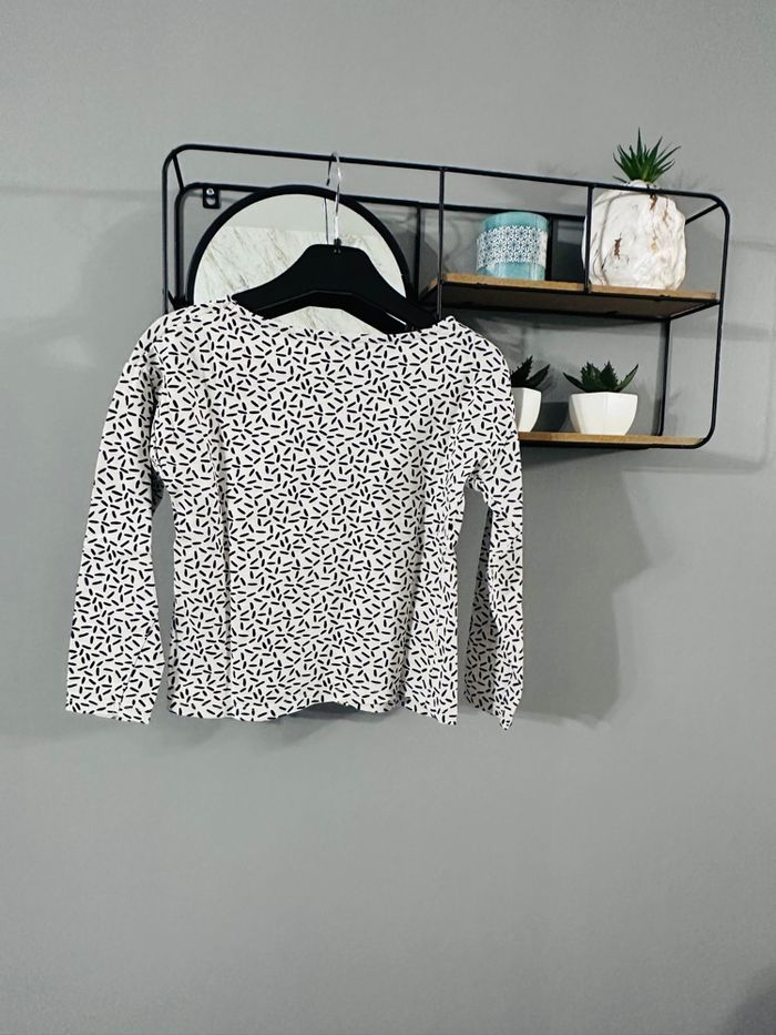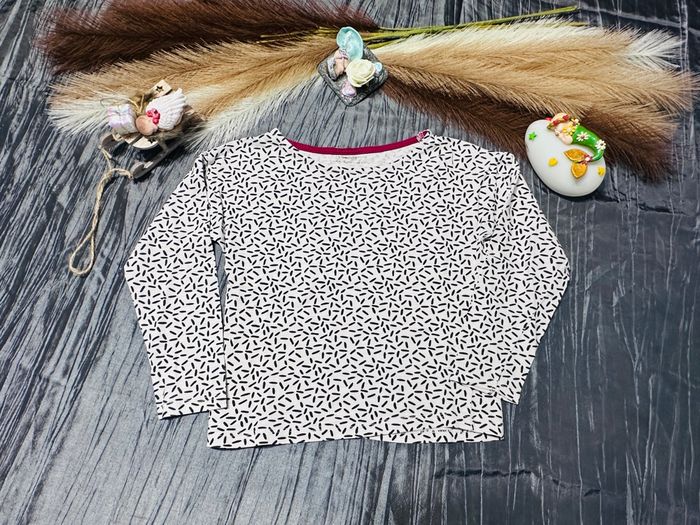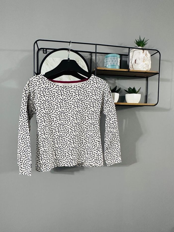 joli haut à manches longues avec un motif graphique noir sur fond blanc (style petits traits/grains de riz). Il possède un liseré bordeaux élégant à l'intérieur du col. • Marque : orchestra • Taille : 5 ans • État : Très bon état, peu porté. • Détails : Matière fluide et agréable à porter. Idéal pour la mi-saison ou sous un gilet.