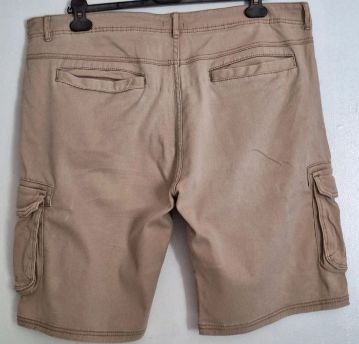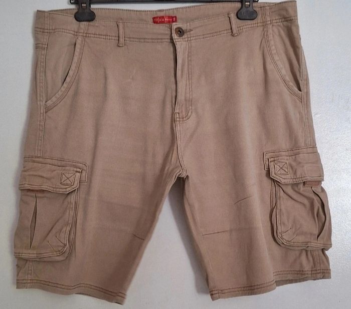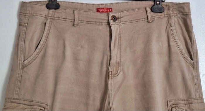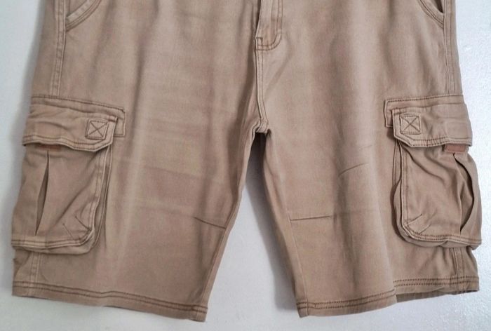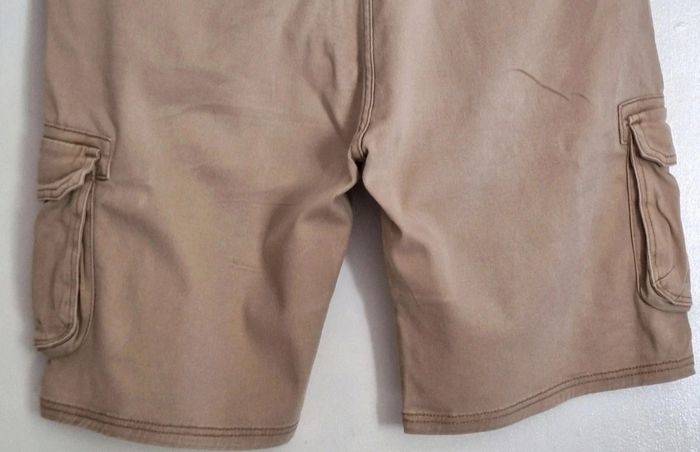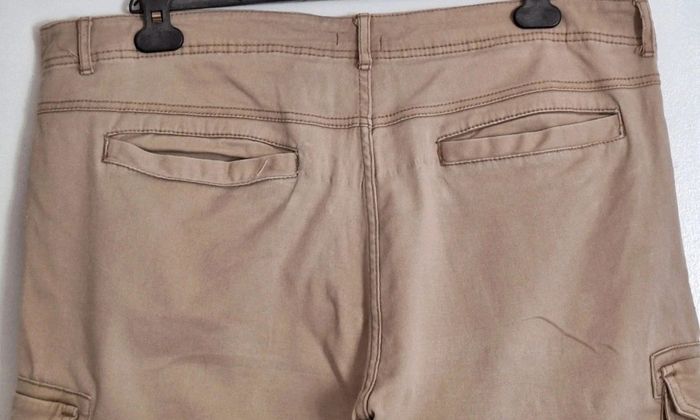 Il a été porté mais peut largement avoir une seconde vie. Il a quelques bouloches. II y a des passants pour une ceinture et la fermeture se fait par bouton et zip. ll y a deux poches devant, des poches cargo sur les cuisses et des poches derrière.