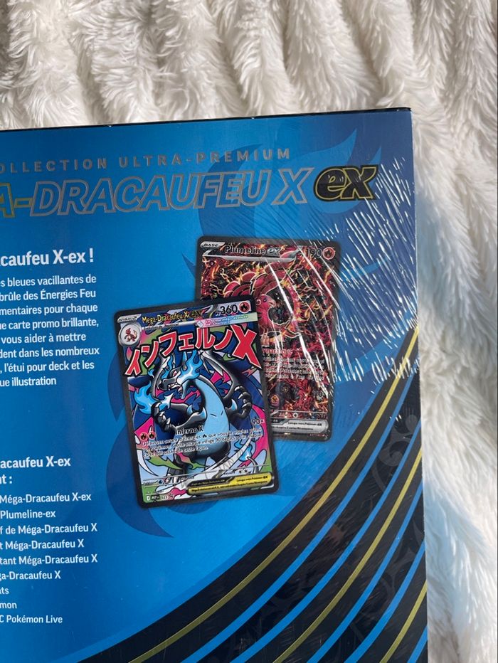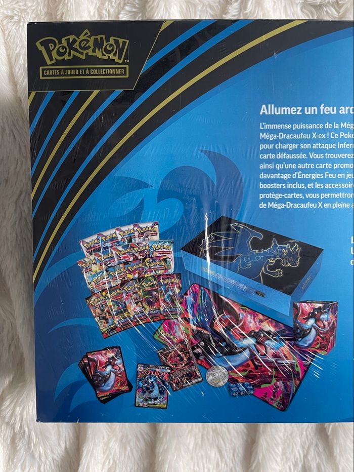 UPC POKÉMON MEGA DRACAUFEU EX -Contient : 2 cartes promo exclusives🎁 - Inclut : 18 boosters,tapis de jeu, pièces, marqueurs, dés, séparateurs, boîte de rangement premium 📦 -Produit neuf scellé, aucun trou ou déchirure dans le scellage mais mauvaise qualité de scellage plastique détendu voir photos ‼️ -Plusieurs exemplaires disponibles sur demande 📨 -Envoi rapide et soigné sous 24/48h📬 -N’hésitez pas à m’envoyer un message si besoin !💌