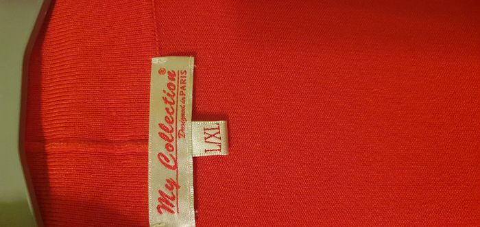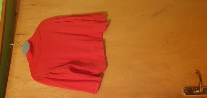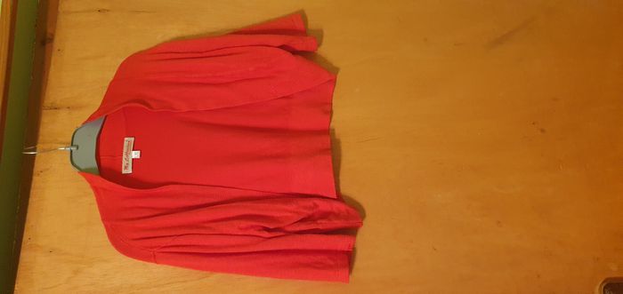 Petit boléro court coloris corail foncé, taille L/XL, de My Collection, 70% viscose, 30% polyamide, manches de 26cms, largeur couture dos d'aisselle à aisselle 44cms, ne se ferme pas, longueur 38cms.