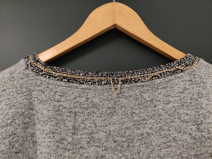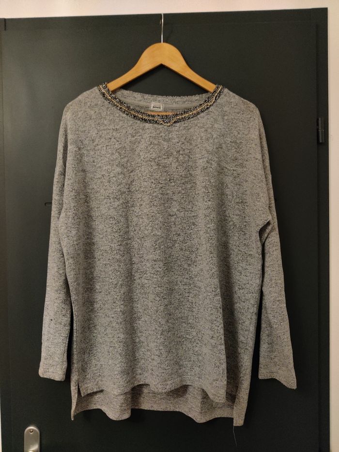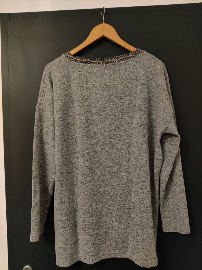 Pull long gris avec col collier, bon état, le collier se défait. Taille L 69% polyester 29% viscose 2% elastane #lolilaurafemme40