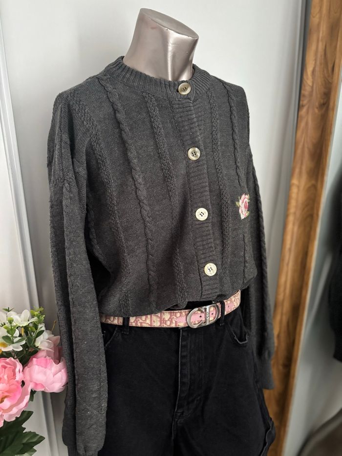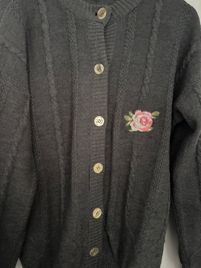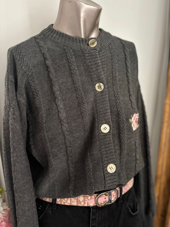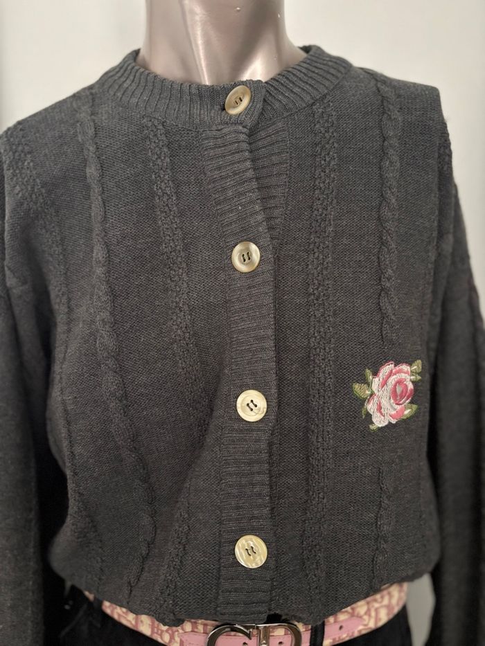 Gilet cardigan pull vintage gris brodé rose Maille torsadée Taille L/XL