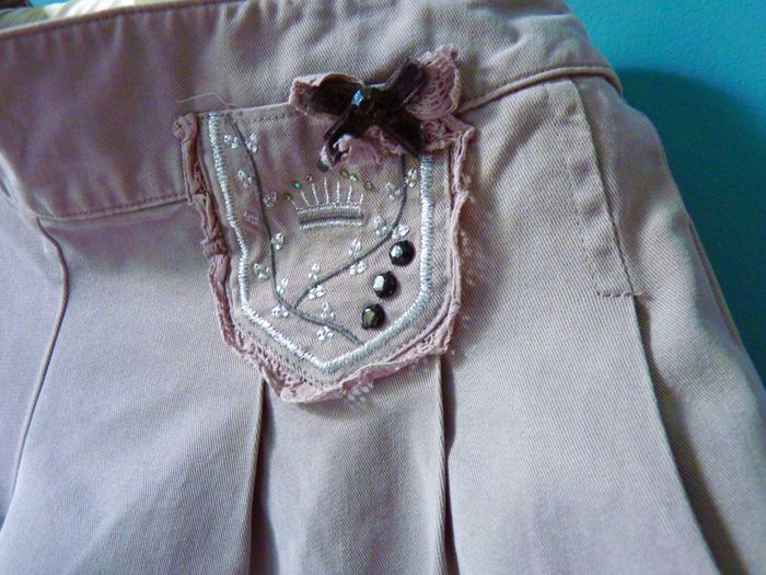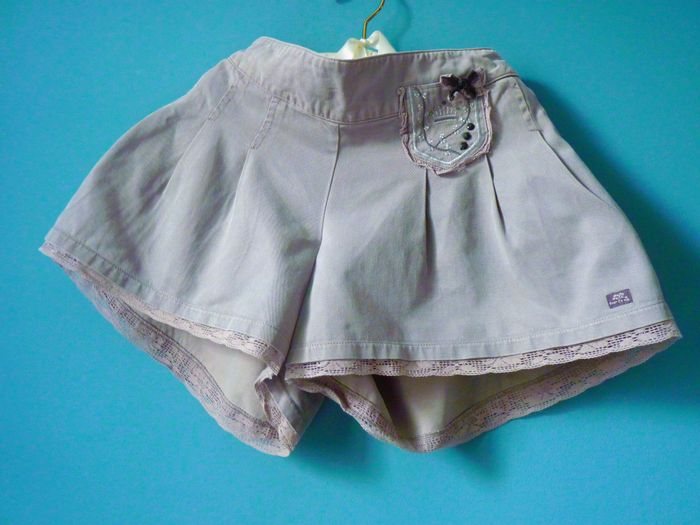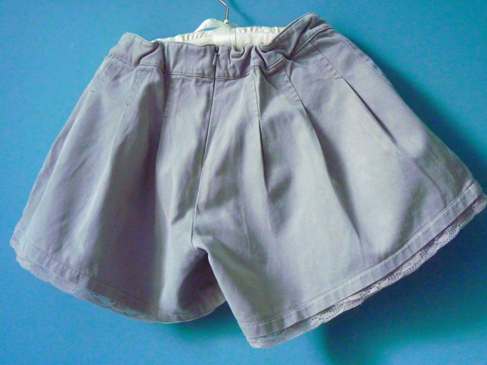 Lili Gaufrette Taille : 10 Ans Short fille gris avec des finitions dentelles, noeud papillon, pampilles et strass TBE - Taille reglable - zip fermeture invisible 61 % viscose + 39 % coton Longueur : 27 cm
