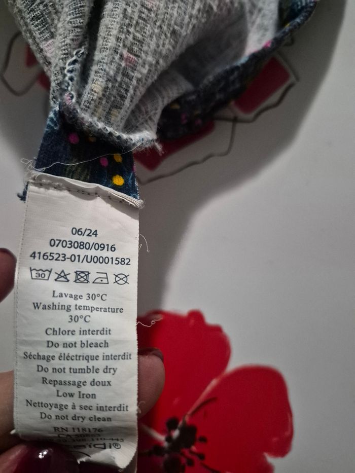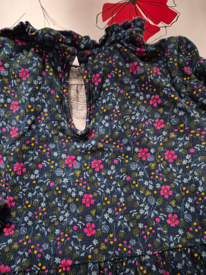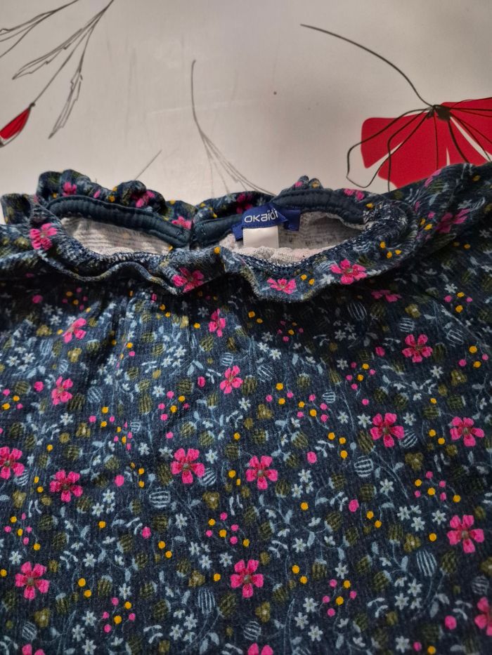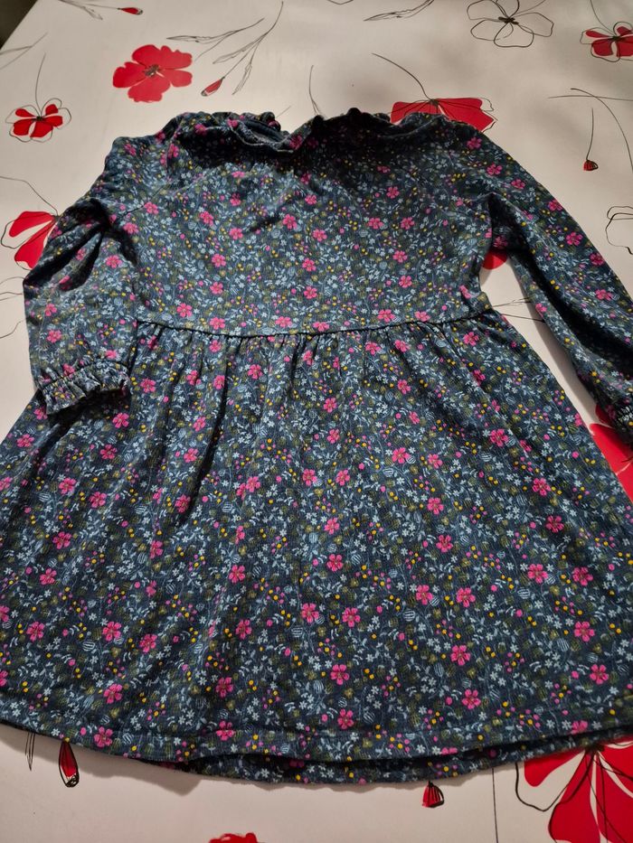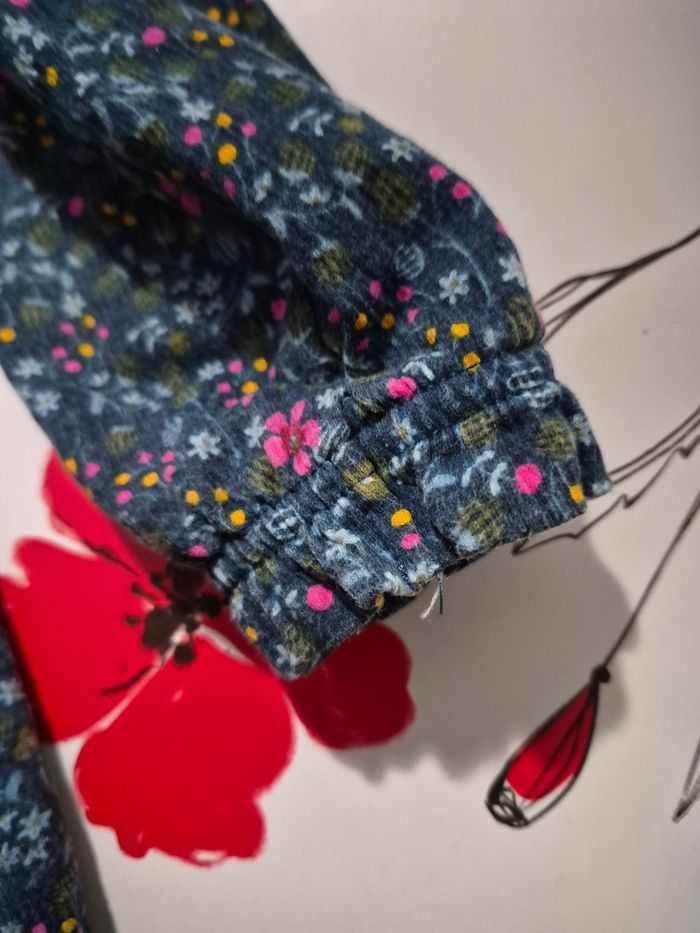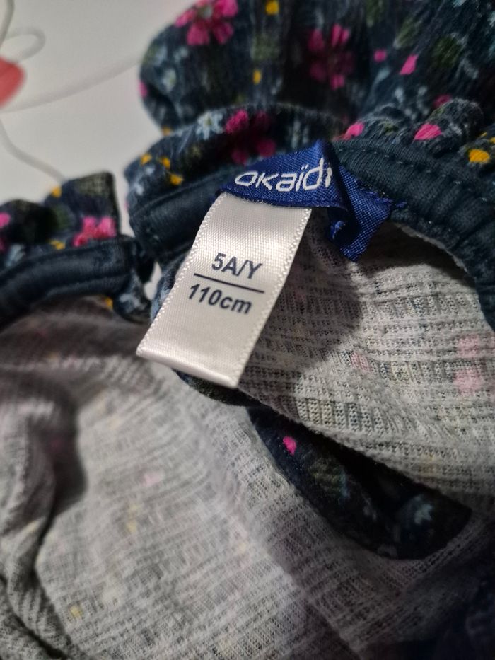 Robe manches longuesc(bas elastiquee) bouton pour fermer au dos, Couleur bleue avec des fleurs Matiere coton, polyester et elasthanne Taille 5 ans 110 cm Marque okaidi Maison non fumeur
