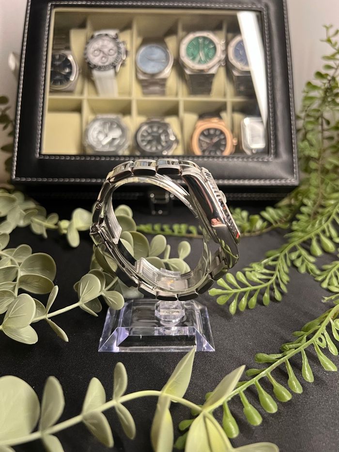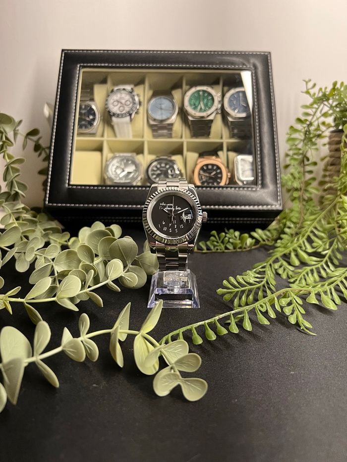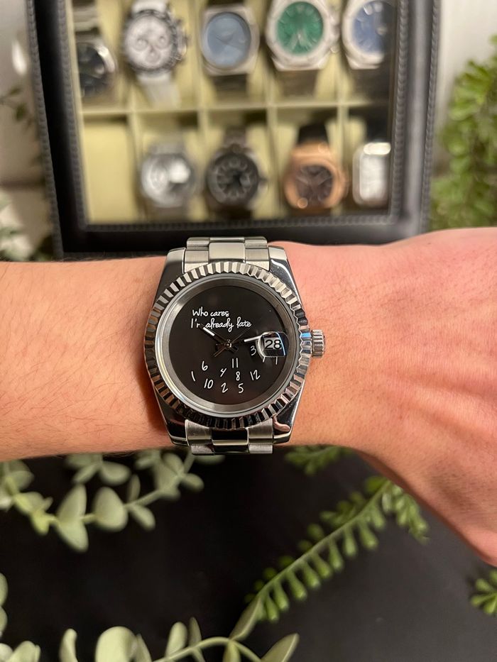 Vous n'êtes jamais à l'heure ? Cette montre est faite pour vous ! Je vends ce Seiko Mod unique, au design minimaliste et plein d'humour. Elle combine le boîtier classique "Datejust" avec un cadran artistique décalé. Les points forts : Design Unique : Cadran noir mat avec l'inscription manuscrite "Who cares, I'm already late" et les chiffres tombés en vrac au fond du cadran. Boîtier de qualité : Type Datejust en acier inoxydable avec lunette cannelée pour un superbe jeu de lumière. Mouvement : Automatique (Seiko NH35), reconnu pour sa robustesse et sa précision. Détails : Loupe "cyclope" sur la date à 3 heures pour une lecture facile. Bracelet : Bracelet Oyster en acier inoxydable, robuste et confortable. État et caractéristiques : État : Neuf / Très bon état (à préciser). Verre : Saphir résistant aux rayures. Style : Un mélange parfait entre luxe classique et esprit rebelle/moderne. C'est une pièce de conversation garantie à chaque fois que quelqu'un vous demandera l'heure ! 📦 Envoi rapide et protégé.