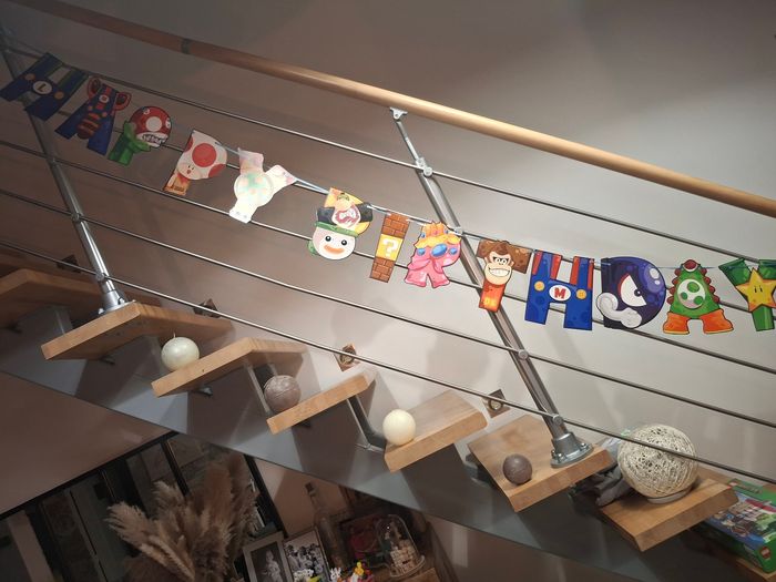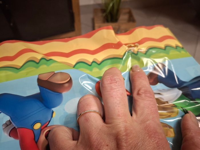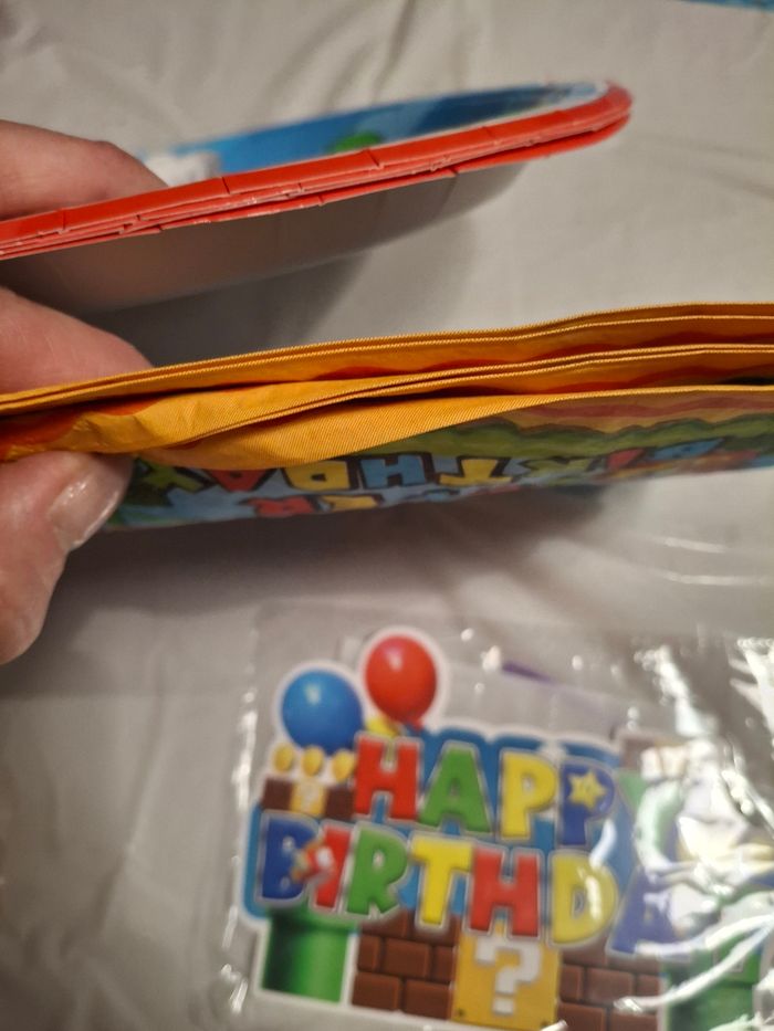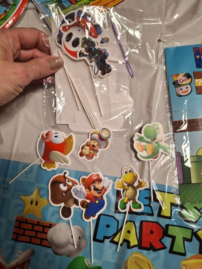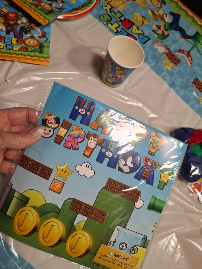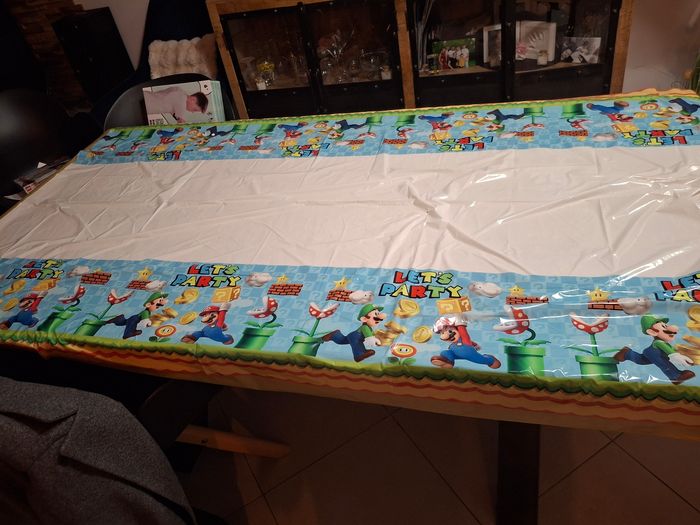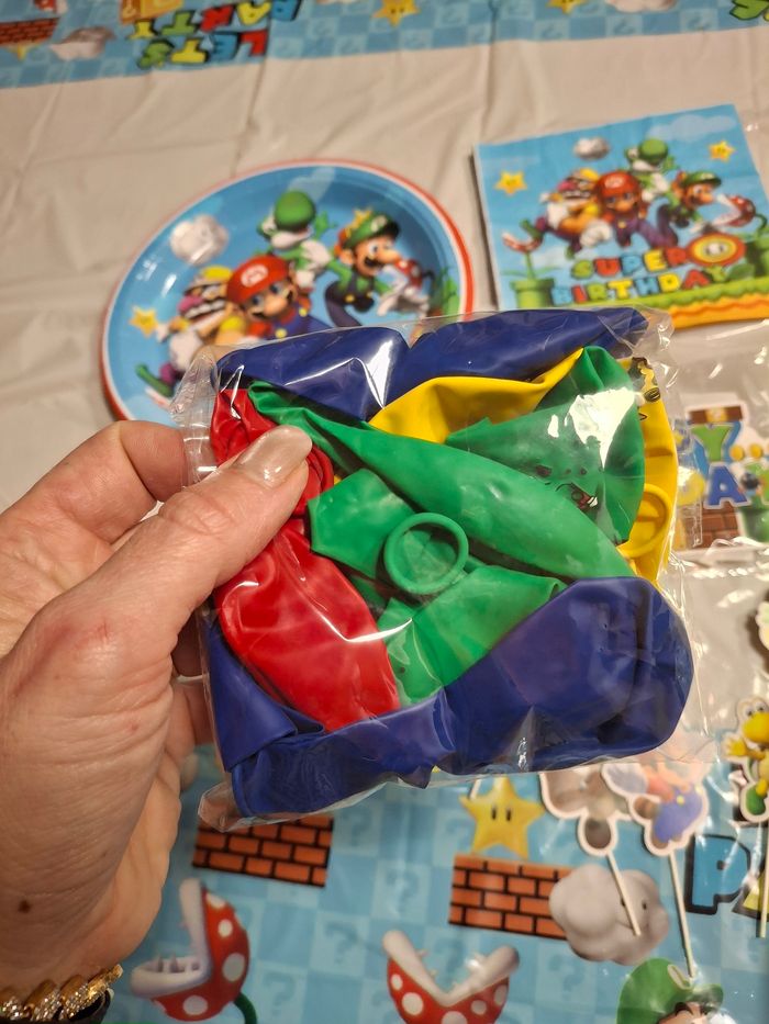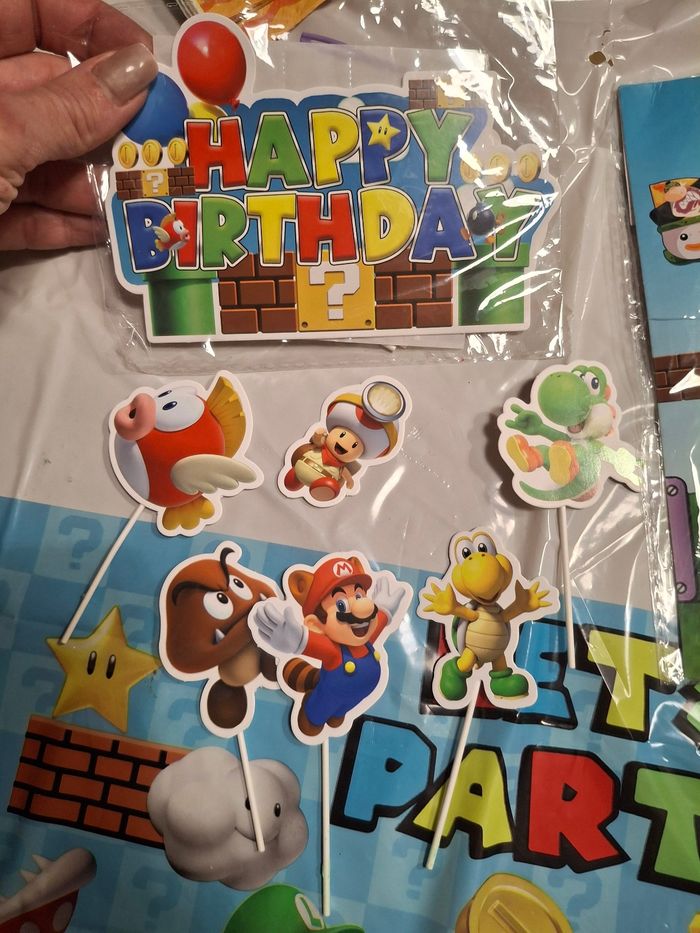 Décoration anniversaire mario reste 5 assiettes 4 serviettes 1 guirlande happy birthday, ballons, topper neuve pour gâteau plis petit topper, nappe 2 petit trou mais peu facilement se cacher