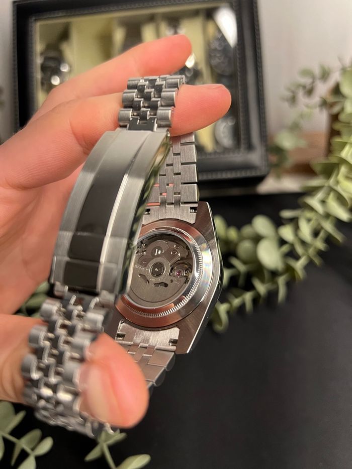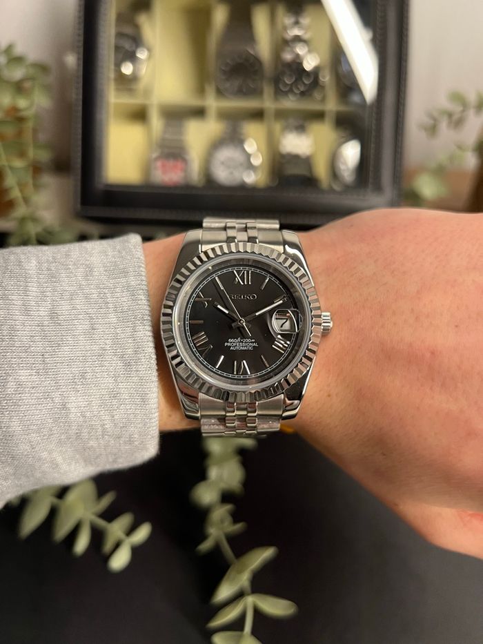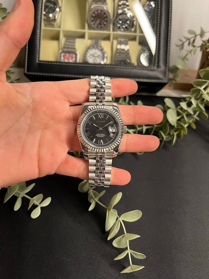 Je mets en vente ce superbe Seiko Mod au design intemporel, inspiré de la célèbre Datejust. C'est une montre qui respire le luxe discret et l'élégance, idéale pour ceux qui cherchent une pièce raffinée et robuste. Caractéristiques et finitions : Mouvement : Automatique Seiko NH35 (connu pour sa précision et sa durabilité légendaire). Cadran : Noir brillant avec chiffres romains en relief, offrant un contraste magnifique. Boîtier : Acier inoxydable 316L avec lunette cannelée qui accroche merveilleusement la lumière. Verre : Saphir inrayable avec loupe cyclope pour une lecture nette de la date. Bracelet : Bracelet Jubilee en acier inoxydable, extrêmement confortable avec ses maillons souples et polis au centre. Détails de l'état : État : Neuf / Très bon état. Le mouvement est visible (ou non, selon le fond) et a été testé pour une tenue de l'heure parfaite. Réglage rapide de la date fonctionnel. Pourquoi choisir ce modèle ? C'est la montre "chic" par définition. Le mélange du cadran à chiffres romains et du bracelet Jubilee lui donne un aspect bijou très haut de gamme. C'est une valeur sûre qui ne se démodera jamais. 📦 Envoi très soigné et rapide garanti.