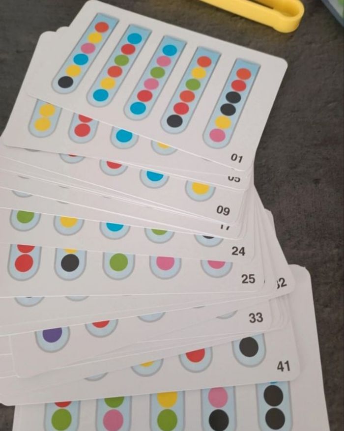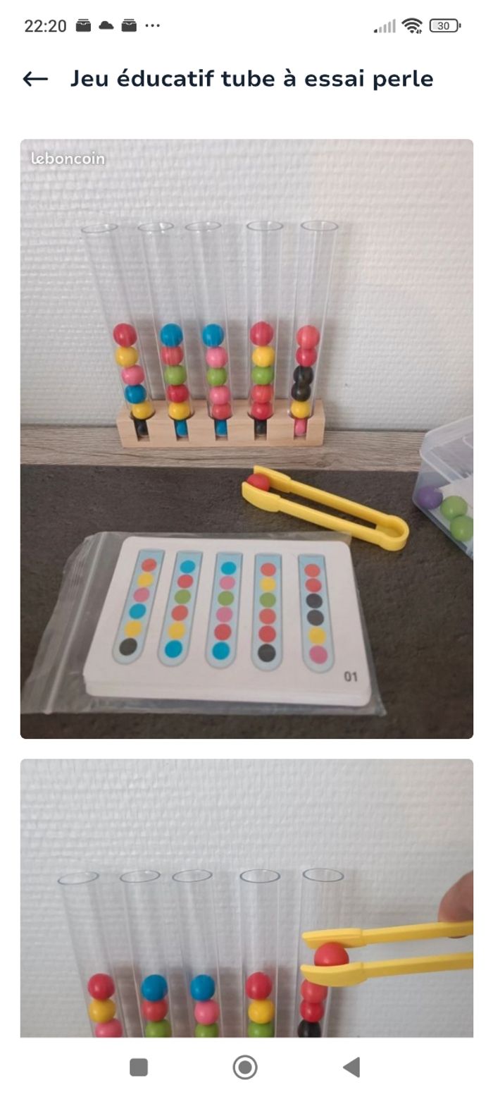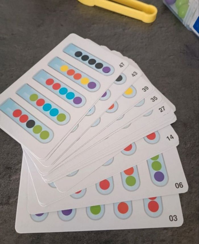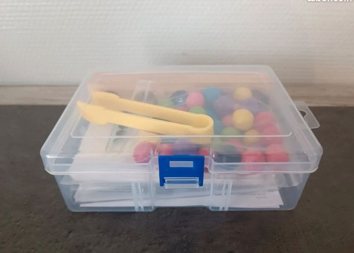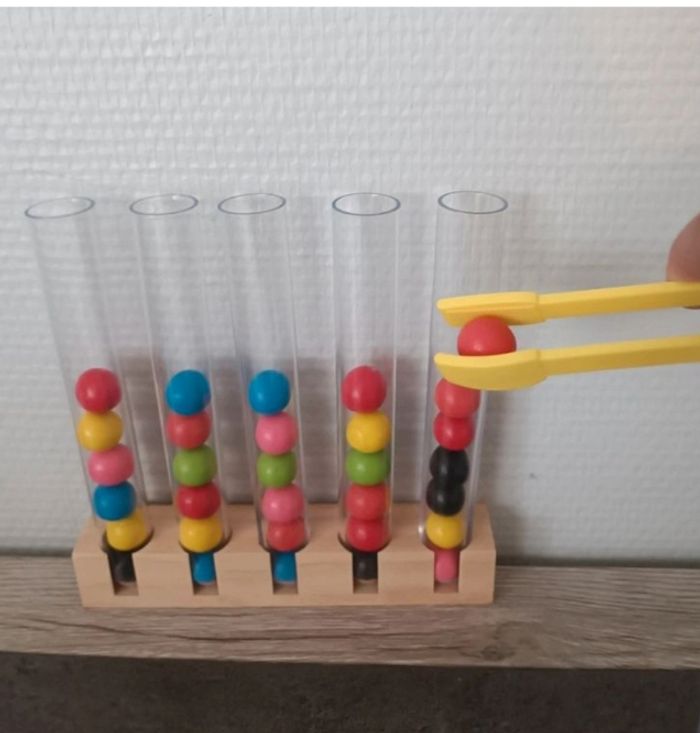 Jeu d’apprentissage ludique et éducatif inspiré de la méthode Montessori, parfait pour développer la logique, la motricité fine et la concentration. L’enfant doit reproduire les modèles proposés sur les cartes en plaçant les perles colorées dans les tubes à essai à l’aide de la pince. Un jeu d’observation, de coordination et de manipulation amusant et stimulant. - 5 tubes transparents avec support en bois - Boules colorées - Pince ergonomique pour la manipulation - Cartes modèles à reproduire - Boîte de rangement Jeu en état impeccable, n'a jamais servi