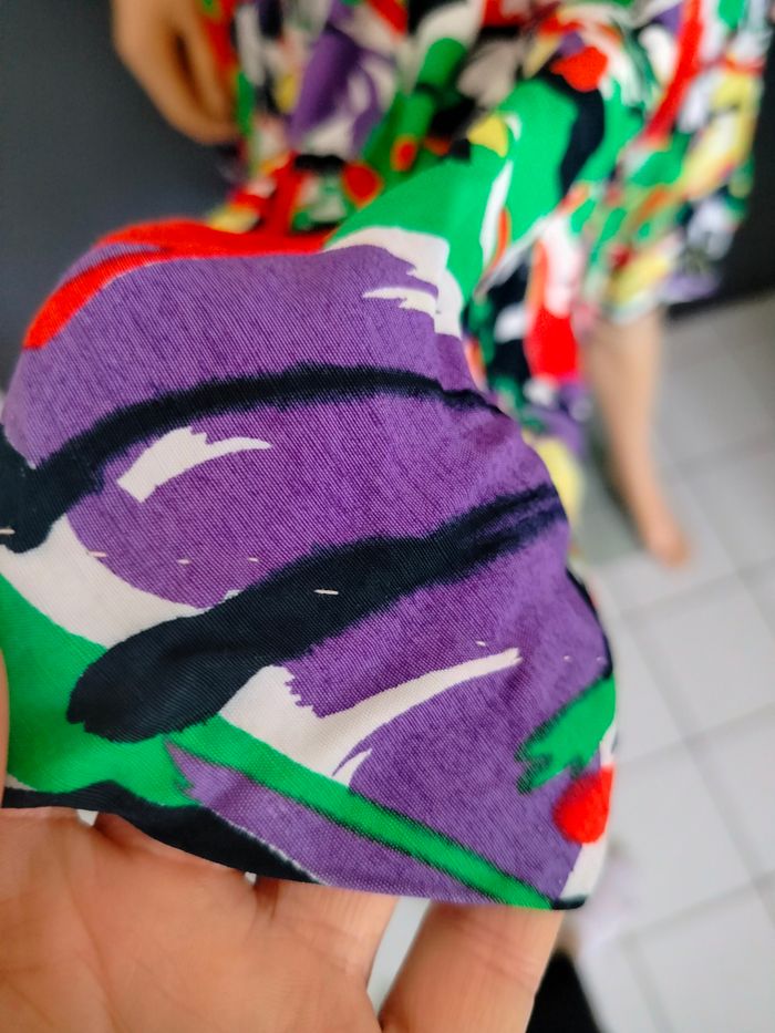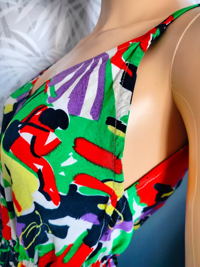 Robe faite main donc possède des petites imperfections de couture visibles en photo. Elle est colorée de couleurs blanc/noir/ rouge / violet/ vert et jaune. De T34/36/38. En bon état car petits accros au même endroit et tâches légèrement noires / marrons : voir photo. Elle a été lavée avec différents produits mais les légères tâches marrons ne sont pas parties. Forme patineuse. Taille élastique. Réf R*327 📏Aisselles : 39cm Taille : 32cm Longueur : 100cm soit 1m #marynlineshop78robe34 #marynlineshop78robe36 #marynlineshop78robe38