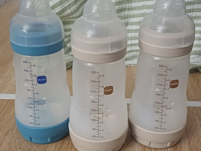 Lot de 3 biberons mam 260 ml. Sans tétines. État moyen Marque: mam