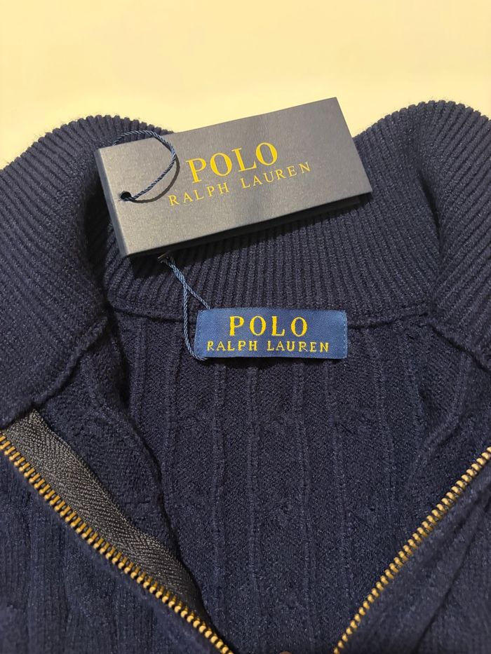 Pull Polo Ralph Lauren pour homme, coloris bleu marine. Maille épaisse torsadée de très bonne qualité, idéale pour l'automne et l'hiver. Col montant avec fermeture zippée, logo cavalier rouge brodé sur la poitrine. Coupe classique, confortable et élégante, facile à porter au quotidien ou pour un style chic. Pull en excellent état, aucune tache ni défaut.
