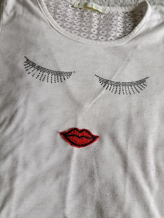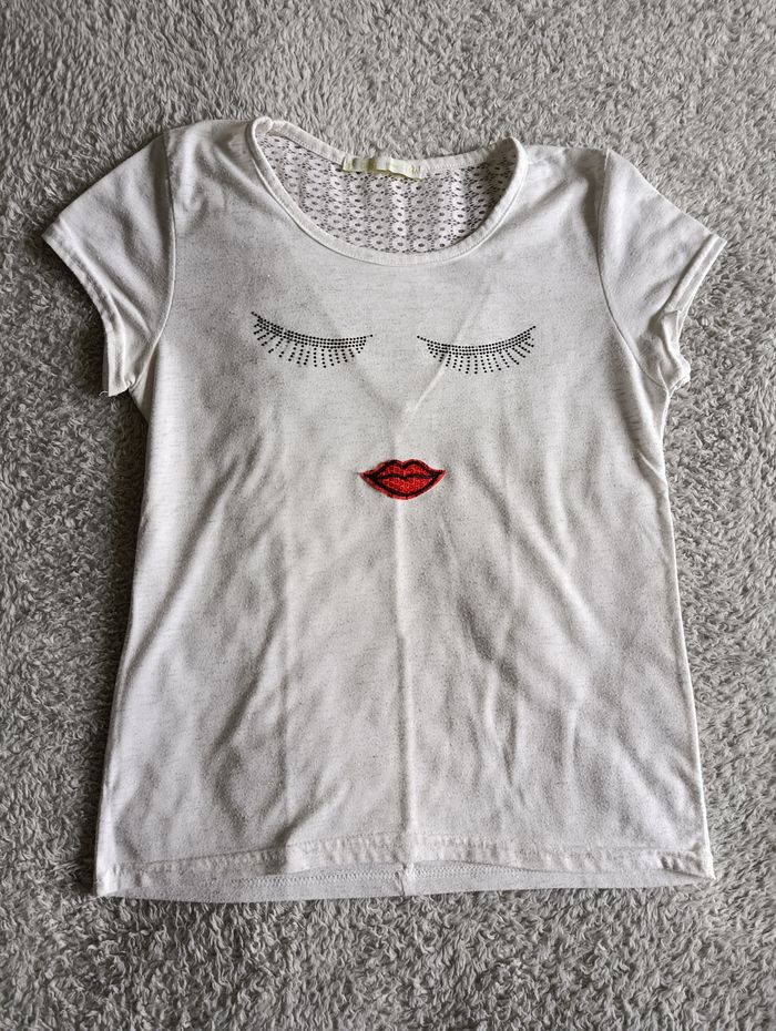 Motif visage original avec yeux fermés en strass 💋 Bouche rouge brillante cousue ✨ Détail féminin et tendance Parfait pour un look casual avec jean, short ou jupe 👖 Facile à porter au quotidien ou pour le collège. 📏 Taille : 14 ans 🎨 Coloris : blanc 🧵 Matière douce et agréable à porter 👌 Coupe confortable 👉 Très bon état 👉 Envoi rapide 📦 👉 Retrouvez d’autres articles ado dans mon dressing
