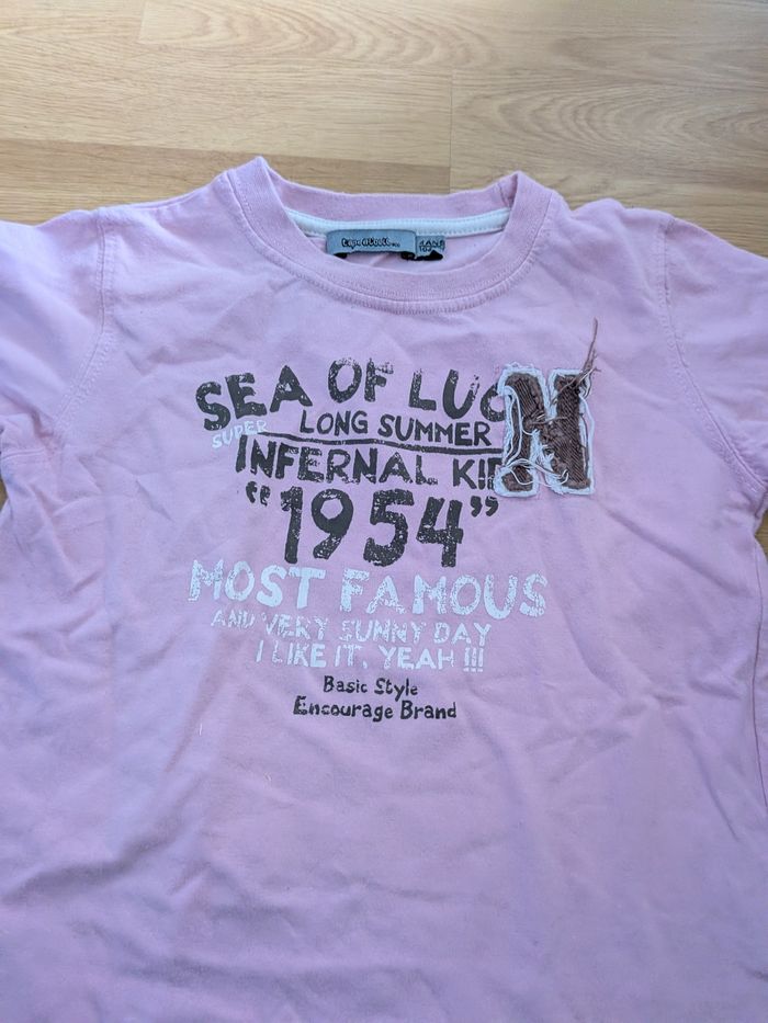 Joli t-shirt manches courtes rose pour enfant, marque Tape à l’œil. 100% coton, agréable à porter, parfait pour l’été. ✨ Motif imprimé sur le devant avec petit détail en tissu cousu. 📌 État : bon état général, mais présence d’un petit défaut au niveau du motif (voir photo : tissu un peu décousu/effiloché). 📏 Taille : 4 ans – 104 cm 🏷️ Composition : 100% coton Idéal pour tous les jours ou en vêtement de rechange 😊
