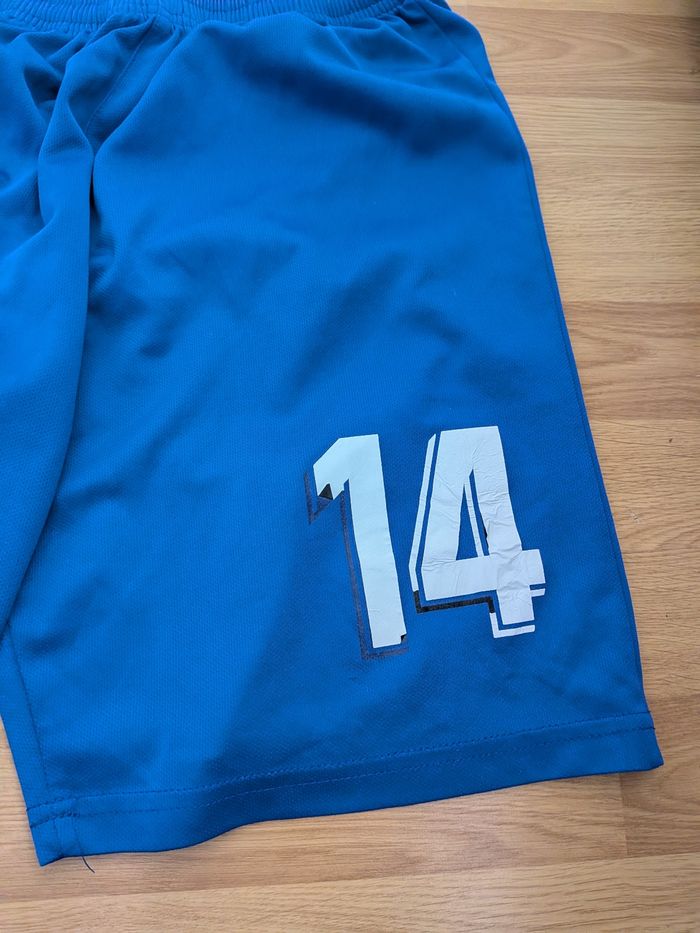 Short de sport bleu, idéal pour le football ou toute activité sportive. Taille M (étiquette visible sur la photo). ✨ Détails : Numéro 14 imprimé sur la jambe Petit écusson style club sur l’autre côté Taille élastique confortable 📌 État : très bon état, peu porté, aucun trou ni tache. Parfait pour l’entraînement ou pour un look sport décontracté 😊