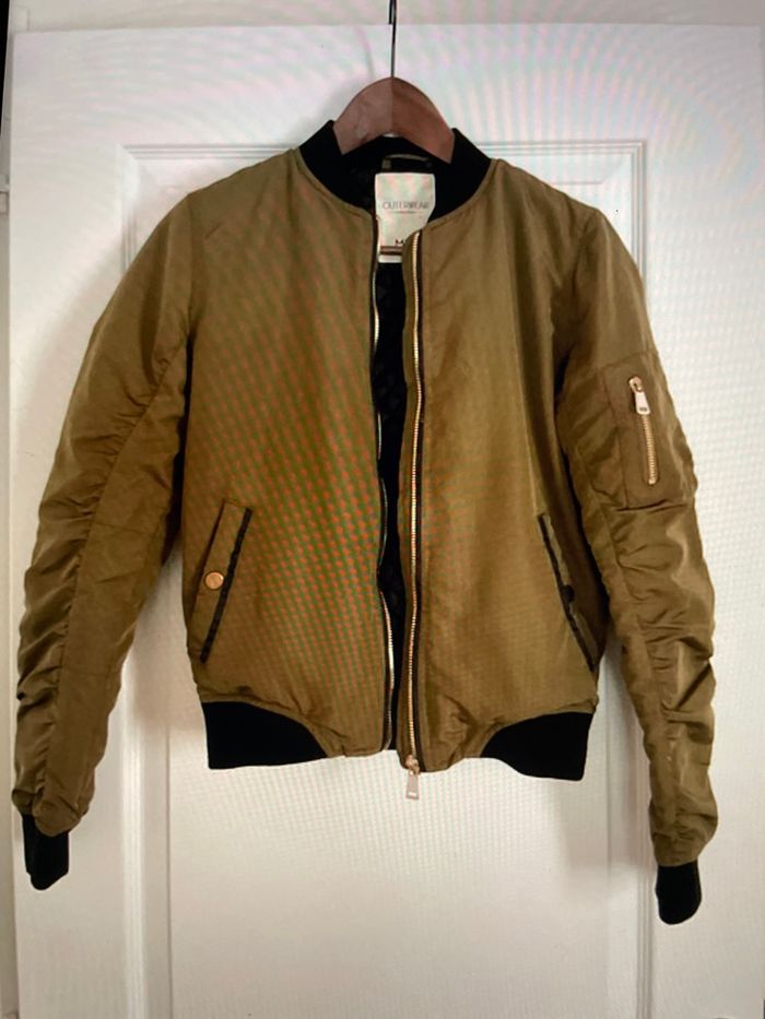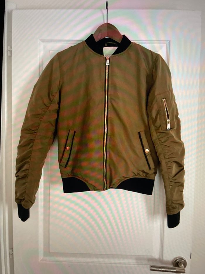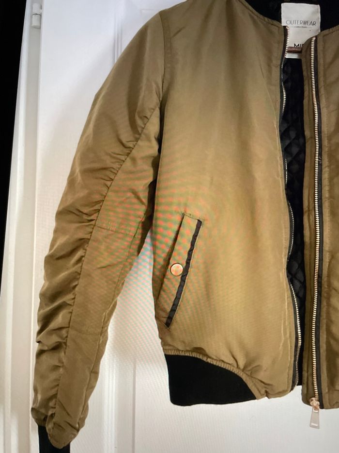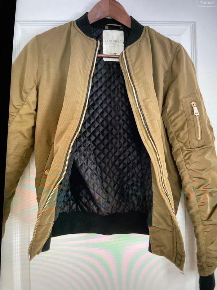 Blouson court, style bombers de la marque MIM OUTERWEAR COLLECTION Taille S Couleur KAKI SATINE 2 poches de chaque côtés avec pression 1 sur la manche gauche Lisseret noir le long de la fermeture éclaire et des poches. Bas du blouson, col et manchettes côte noire. Petits plis sur les 2 manches L'intérieur est molletonne noir. Très beau 😍