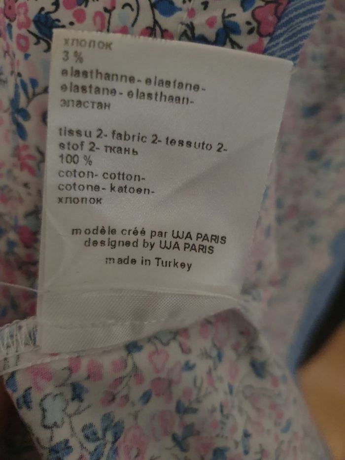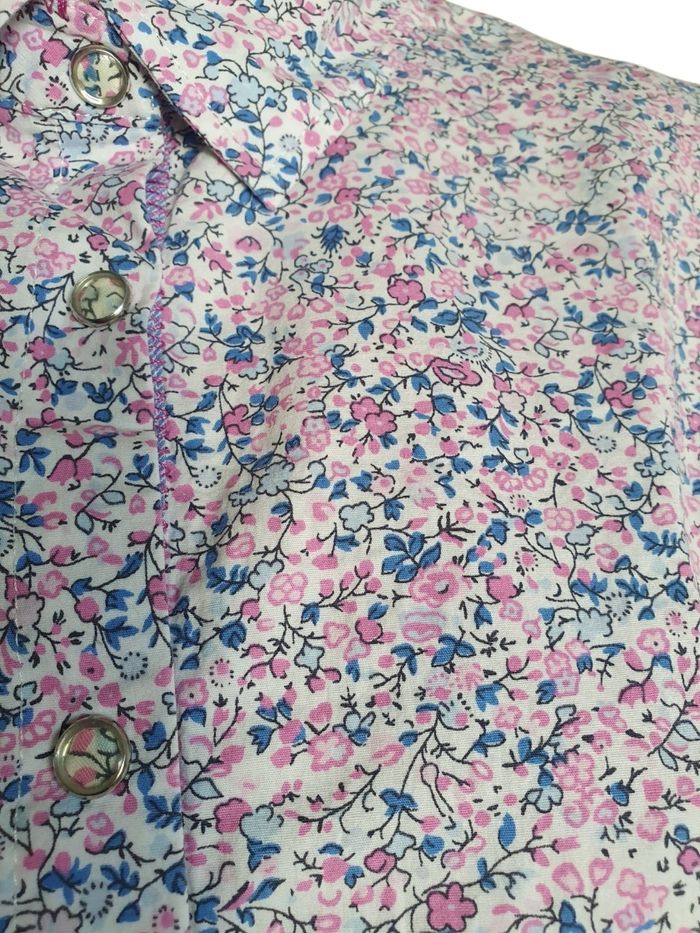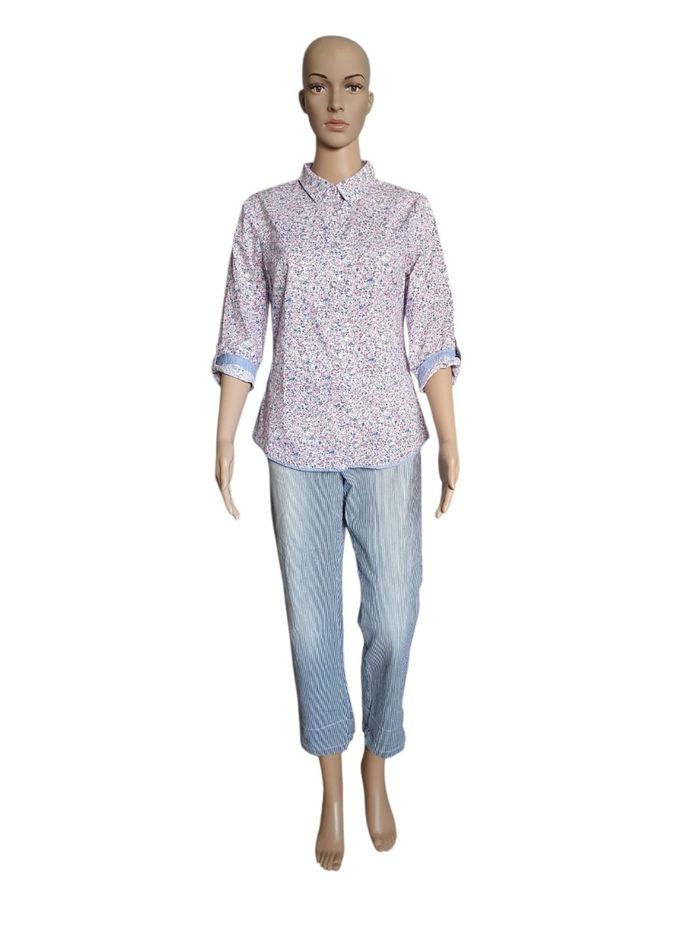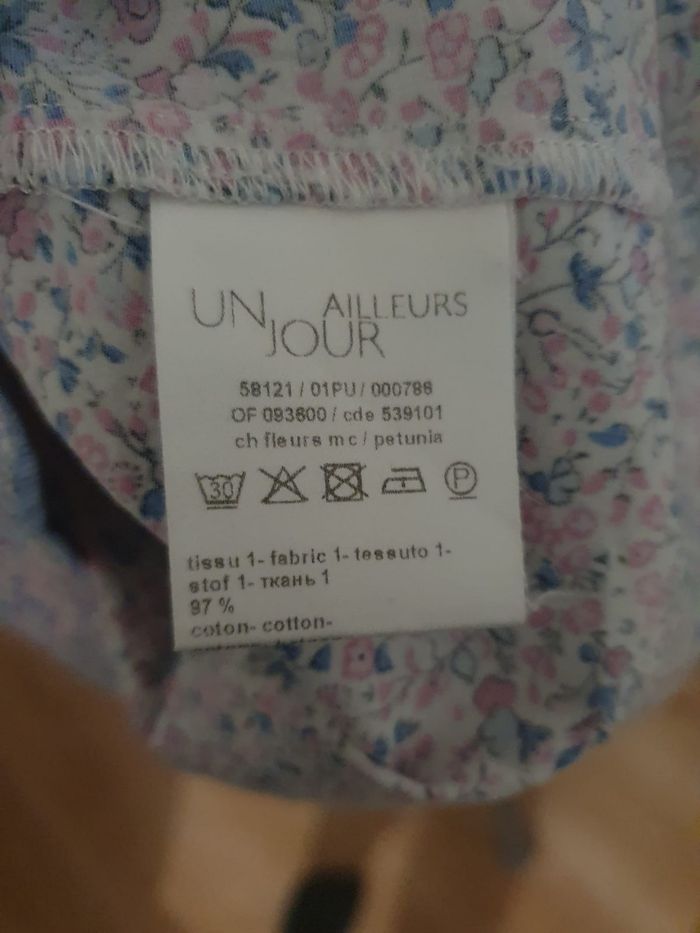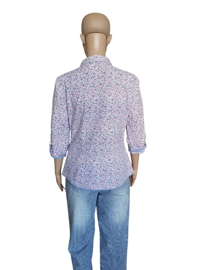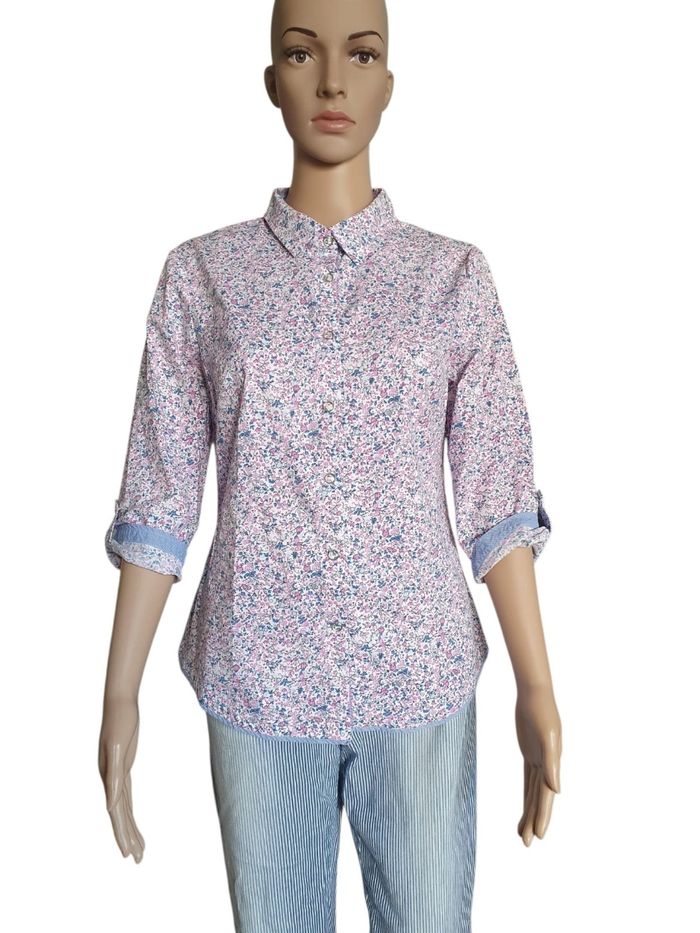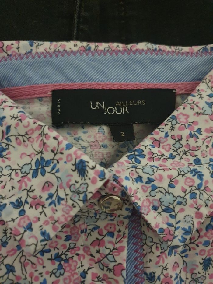 🌸 Ajoutez une touche de fraîcheur à votre garde-robe avec ce chemisier fleuri signé par la célèbre marque de prêt-à-porter Un Jour Ailleurs Paris. Ce haut à manches 3/4 est la pièce idéale pour celles qui recherchent un look à la fois élégant et décontracté, typique de la mode féminine française. 🌺 Un imprimé floral intemporel (Style Liberty) 🌺 🌼 Inspirée par la tendance imprimé Liberty, cette chemise arbore un motif de petites fleurs délicates dans les nuances de rose pastel et bleu ciel. C'est un vêtement polyvalent qui s'adapte aussi bien à une tenue de bureau (style working girl) qu'à une sortie estivale en terrasse. 🌻 Confort stretch : Composé de 97% coton naturel et 3% élasthanne, ce tissu offre une respirabilité maximale tout en étant légèrement extensible pour épouser votre morphologie. 🌹 Détails contrastés : Les revers de manches et l'intérieur du col sont doublés d'un tissu 100% coton à rayures bleues, apportant une finition "couture" unique. 🪻Détails : Boutons nacrés élégants et col chemise classique. 🏷 Marque : Un Jour Ailleurs  🔸️ Modèle : Pétunia 📐 Taille 38 (M) 🧶 97% coton,  3% Elasthanne  🏠 Prix boutique : 129€ 📏 Pour vous assurez qu'elle vous ira parfaitement fiez-vous à la grande sagesse de Maître Ruban ⤵️  Épaule à épaule : 42cm Aisselle à Aisselle : 47cm  Longeur 59cm Manches: 44cm 💡Suggestion look  Pour un look chic décontracté, associez-la à un jean blanc et des sandales. Pour une occasion plus formelle, glissez-la sous un blazer marine. C’est une pièce de mi-saison indispensable, durable et facile d'entretien. Pour un look complet retrouvez le pantalon assorti sur notre boutique.  🌟 Très bon état 🌟  📦 Envoi rapide et soigné    📍 Un Jour Ailleurs, Chemisier Femme, Imprimé Floral, Style Liberty, Coton Stretch, Haut Chic Femme, Taille 38, Taille 2, Mode Seconde Main Luxe
