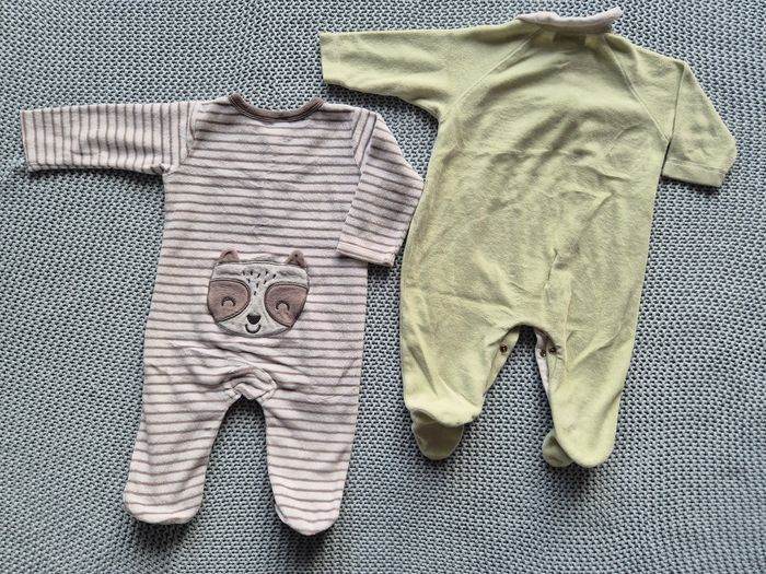 Lot de 2 pyjamas unisexe Marque Tex : rayé raton laveur. Marque Sucre d'orge : blanc et vert " Coucou je suis un tout petit sucre d'orge" Taille 6 mois. #mimidacgarçon #mimidacfille #mimidacgarçon6mois #mimidacfille6mois