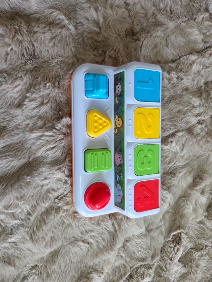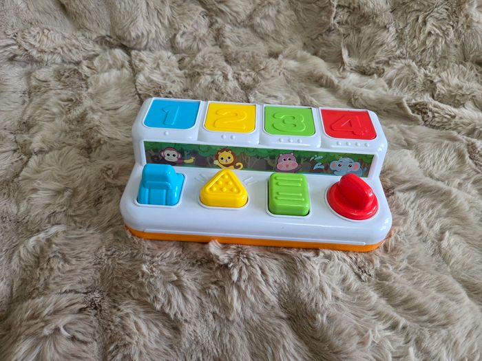 Jouet mécanique de 9 mois à 3 ans. Differents animaux se cachent sous les clapets, entraîne la motricité fine ( appuyer, tourner, tirer) et plus tard les couleurs et les chiffres de 1 à 4.