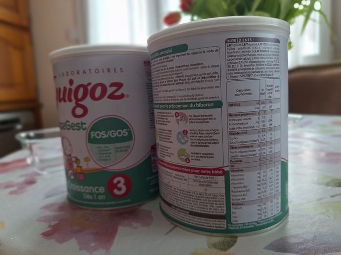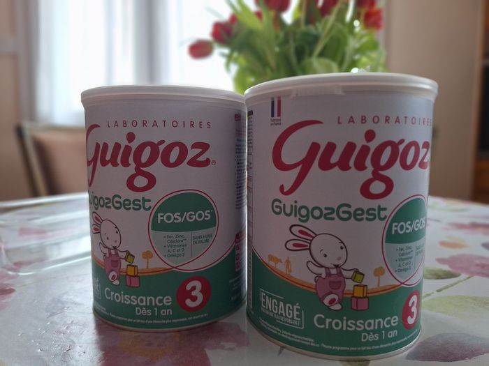 Bonjour, je vends deux boîtes de lait pour bébé 3eme âge GuigozGest (épaissi), neuves. DLC 07/2027