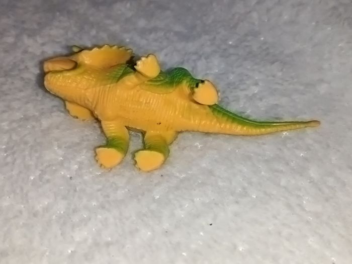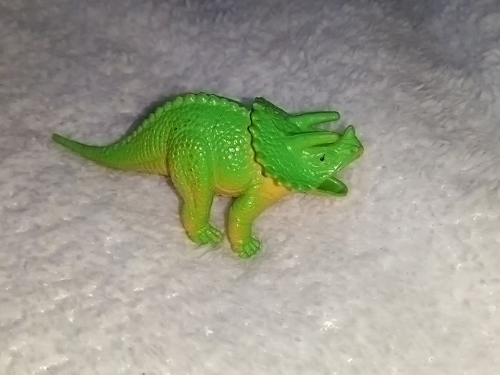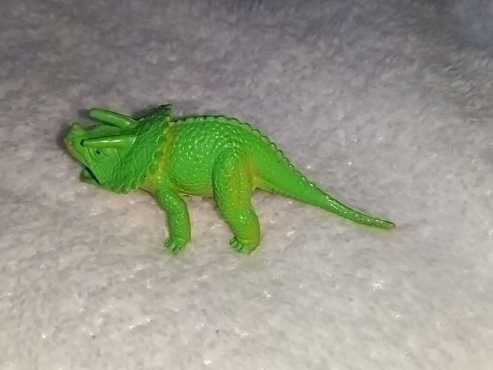 Vends cette figurine de dinosaure herbivore aux couleurs vives (vert et jaune). Espèce : Ressemble à un Triceratops / Styracosaure. Dimensions : Mesure environ 10 cm de long. Détail particulier : Il y a une petite bille coincée à l'intérieur qui fait un léger bruit de grelot quand on le secoue (amusant pour les enfants ou à noter pour les collectionneurs). État : Bon état général, les couleurs sont encore bien présentes (voir photos pour les détails). Idéal pour compléter une collection de dinosaures ou pour jouer ! #skms62141_dinosaure #dinosaure #dinosaur #jouet #figurine #triceratops #styracosaurus #styracosaure #enfant