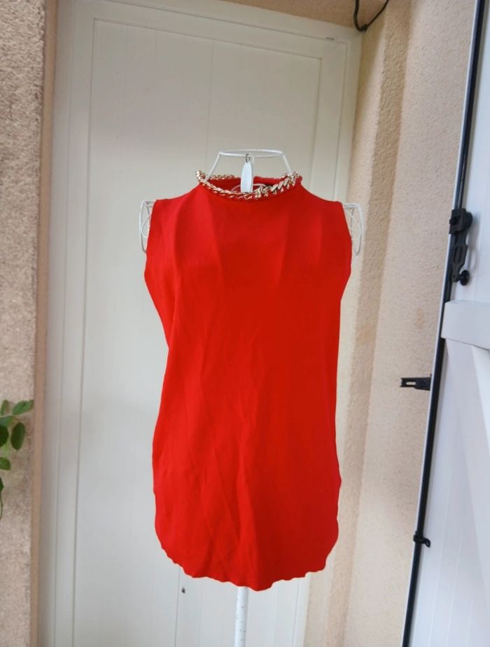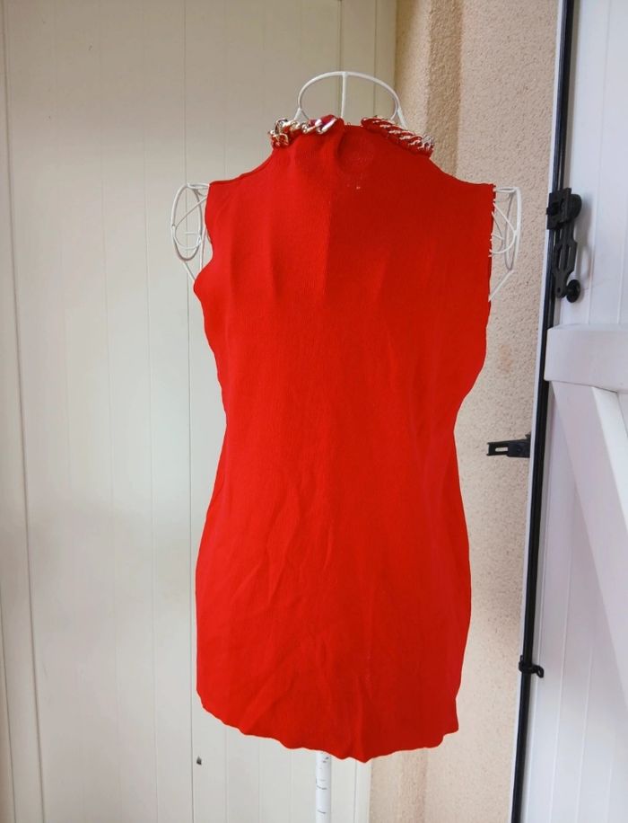 Coloris rouge tissus epais col rond avec chaînette dorée autour bouton derrière