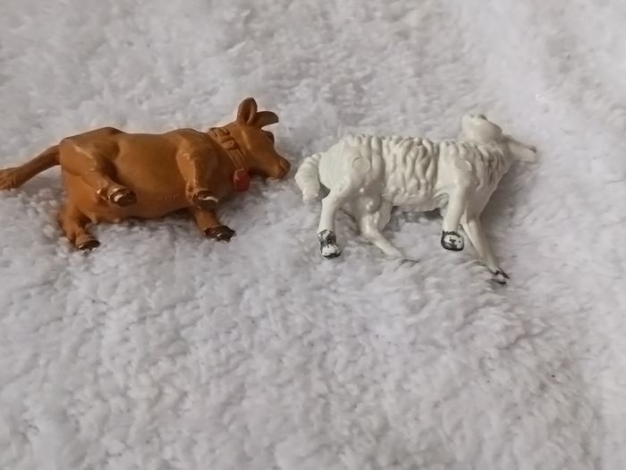 Petit lot de deux figurines d'animaux de la ferme en plastique rigide. Idéal pour compléter un univers de jeu pour enfant ou pour une décoration de type diorama. 1 Vache marron avec une petite cloche rouge peinte au cou. 1 Bélier blanc avec cornes détaillées. Dimensions : Environ 7 cm et 8 cm de longueur. État : Bon état général. Présente quelques légères traces d'usure de peinture (voir photos), ce qui leur donne un aspect vintage authentique. #skms62141_animaux #figurine #animaux #ferme #jouet #vache #belier #jouetenfant #miniature #campagne