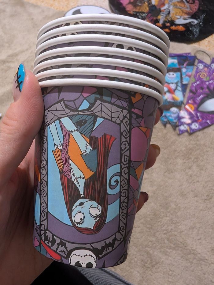 Bonjour Je vends ce lot anniversaire jack le squelette en bon état possibilités de traces d'usure puisqu'il s'agit d'occasion voir photos vous achetez ce que vous voyez Il y a deux ballons de l'univers jack qui ont été gonflés et dégonflés une fois. Plusieurs décos que jai imprimé et plastifié pour coller sur les murs et les ballons. Une guirlande avec deux côtés servie une fois Un lot neuf de sachets surprises (une a été prise dans le lot donc il en reste 9) 7 serviettes et 7 verres neufs jamais servis mais ouverts pour poser sur la table en deco. Un lot de 10 assiettes neuves encore emballées Et je laisse deux sachets que deux enfants ont oubliés